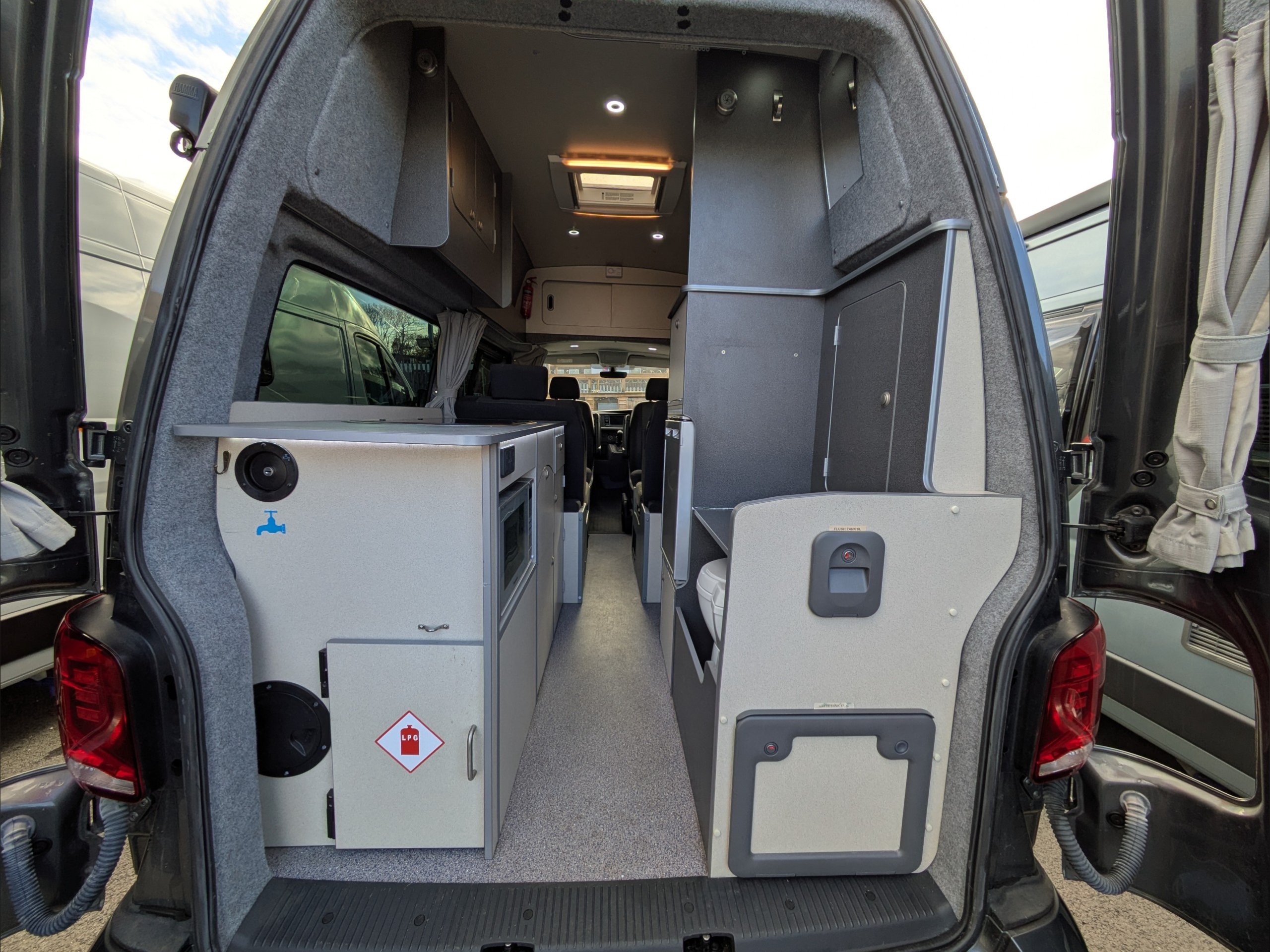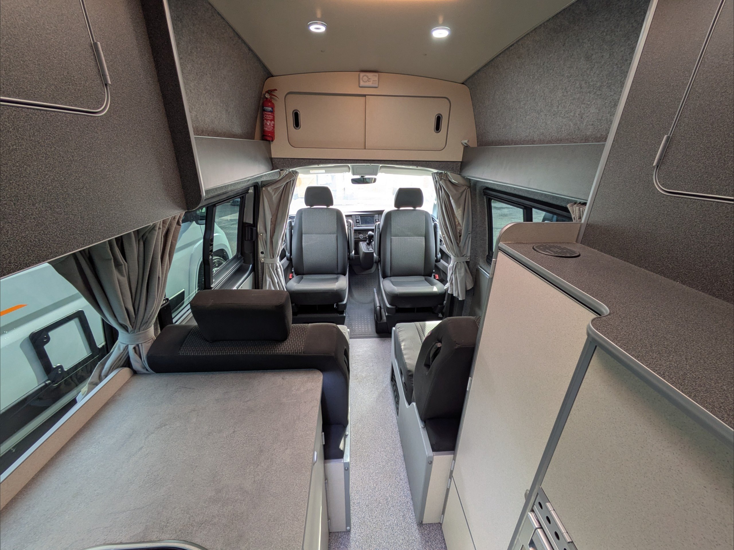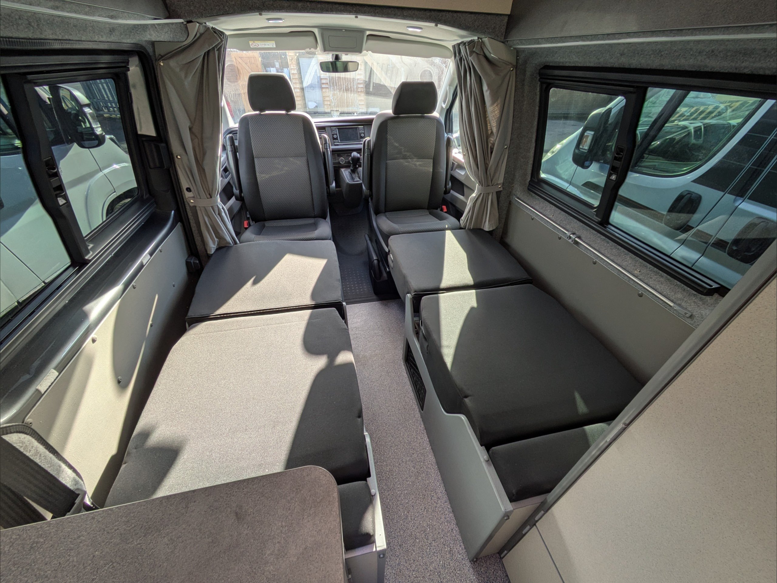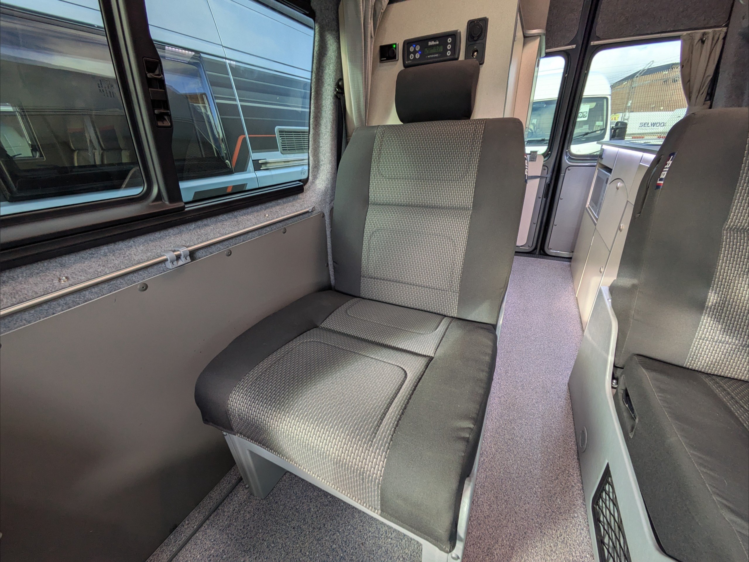 VW Bilbos Nexa Plus. Only 2 made! 4WD, 200BHP. 2 Berth, 4 Seatbelt. Standard Driving License Applicable. ULEZ Compliant. Situated at the front, the lounge can seat 4 people and converts to twin single beds. At the rear is the kitchen which comes with 12 volt fridge, hob, sink, and microwave. This layout also comes with a fitted cassette toilet. Available at the Southern Motorhome Centre now.