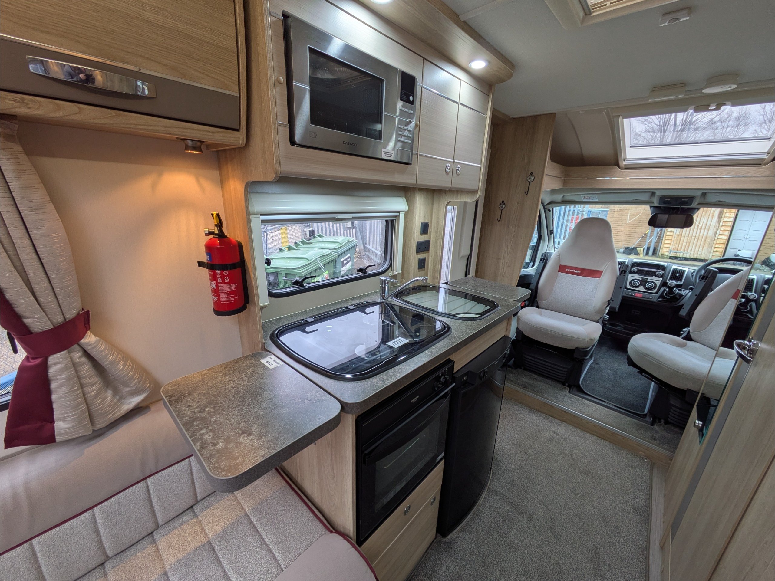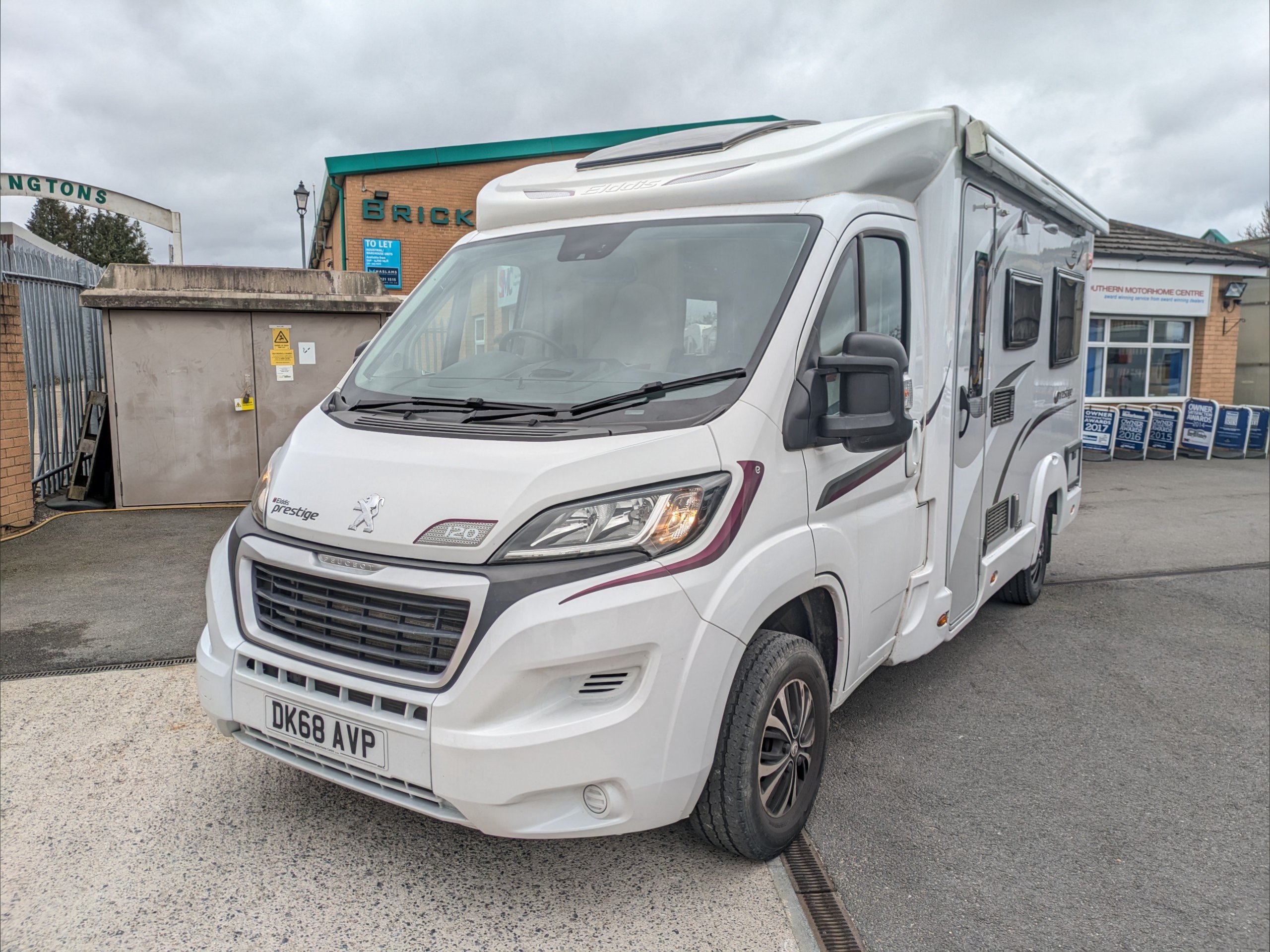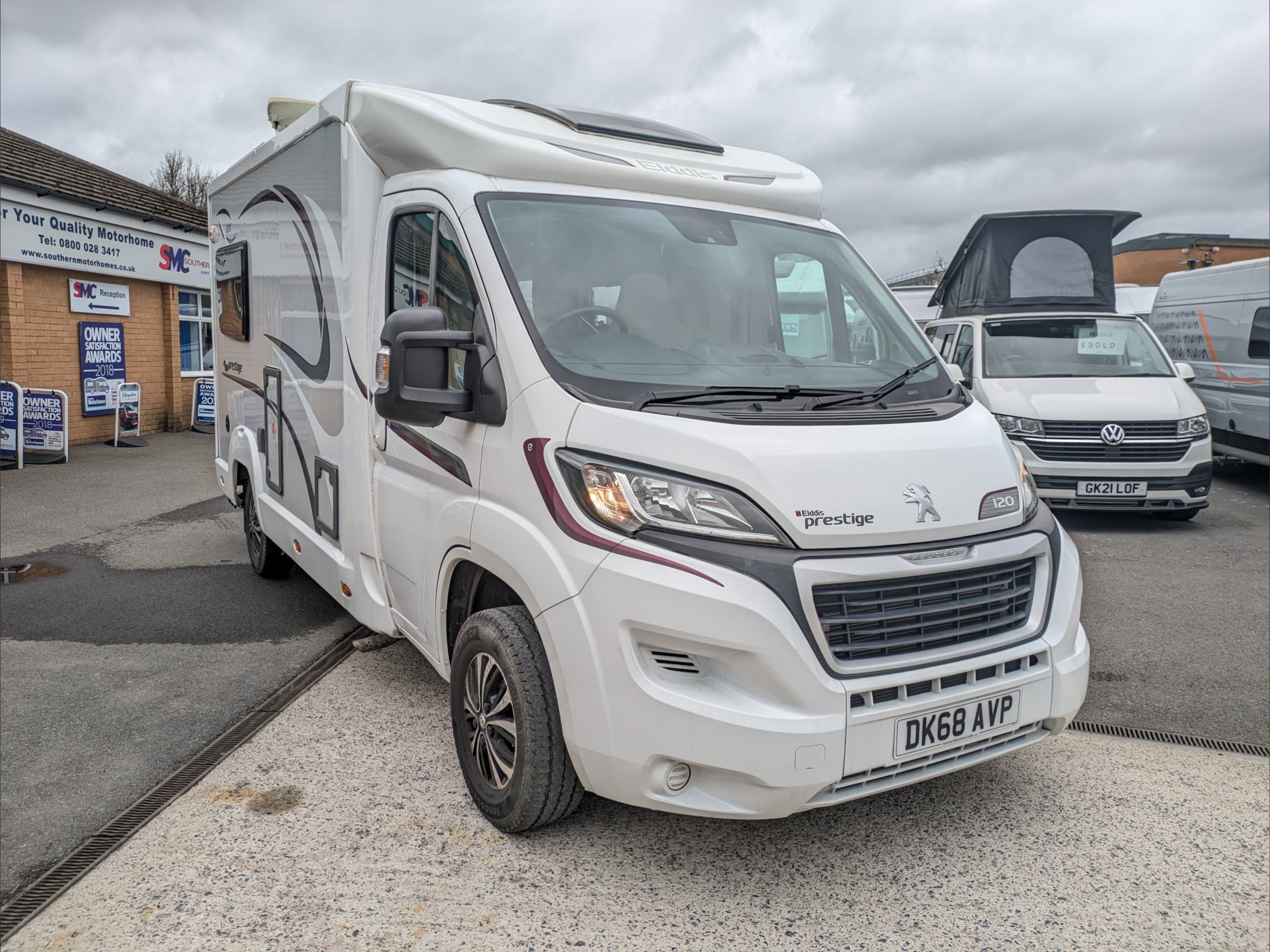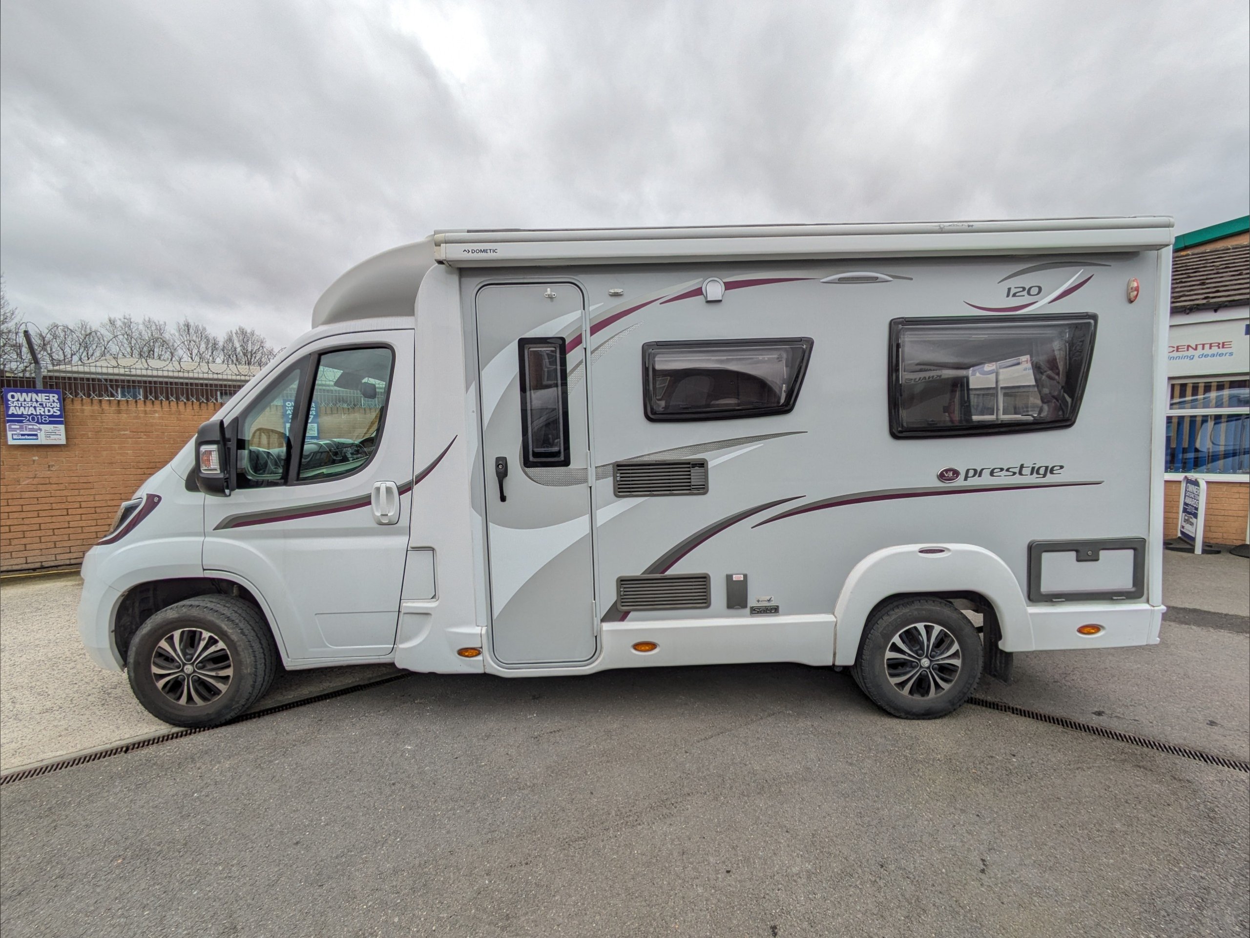 Elddis Prestige 120. 2 Berth, 2 Seatbelts. Standard Driving License Applicable. ULEZ Compliant. Situated at the rear, the versatile lounge can convert benches to U shaped, and converts to either twin single beds or a large double. The kitchen comes with extending counter tops, hob, sink, 3 way fridge, intergrill, and microwave. The washroom comes with shower, wash basin, and cassette toilet. Available at the Southern Motorhome Centre now.