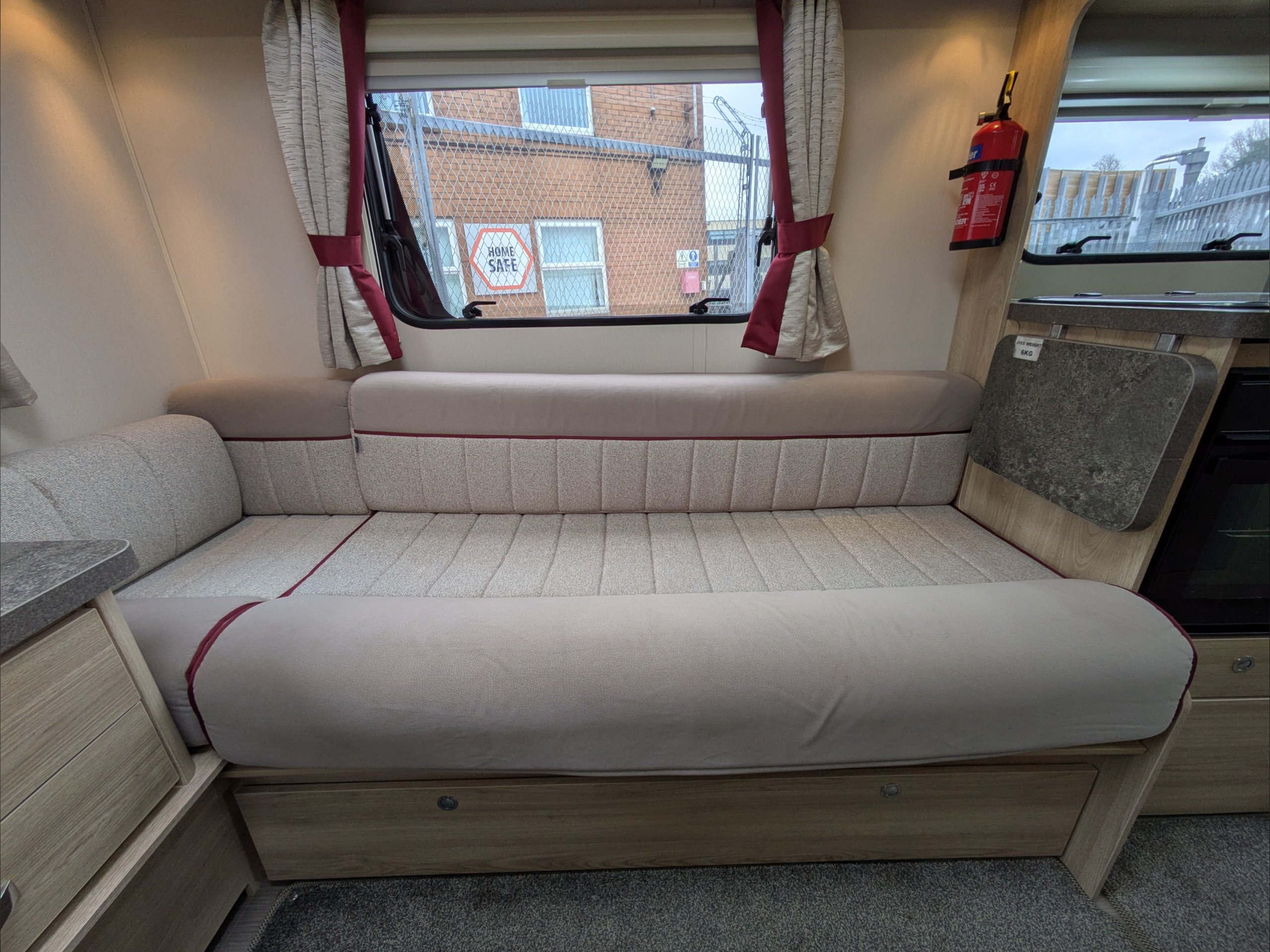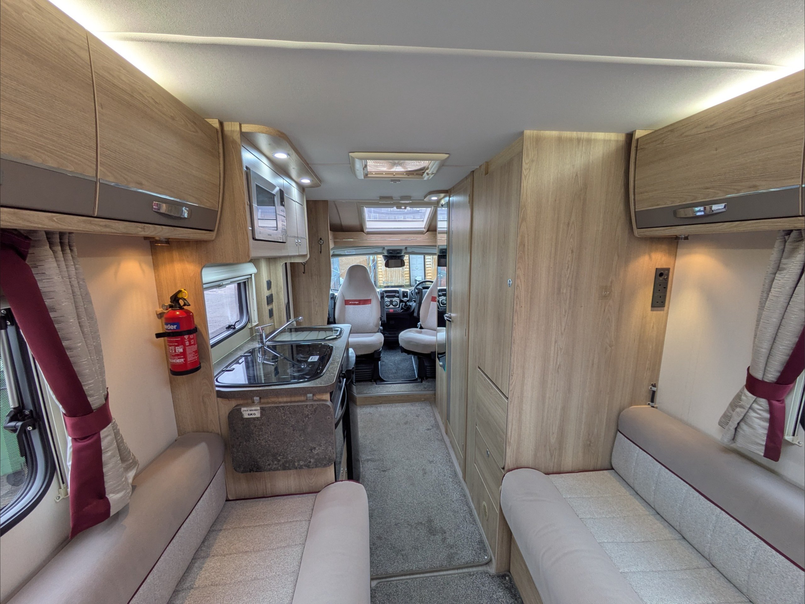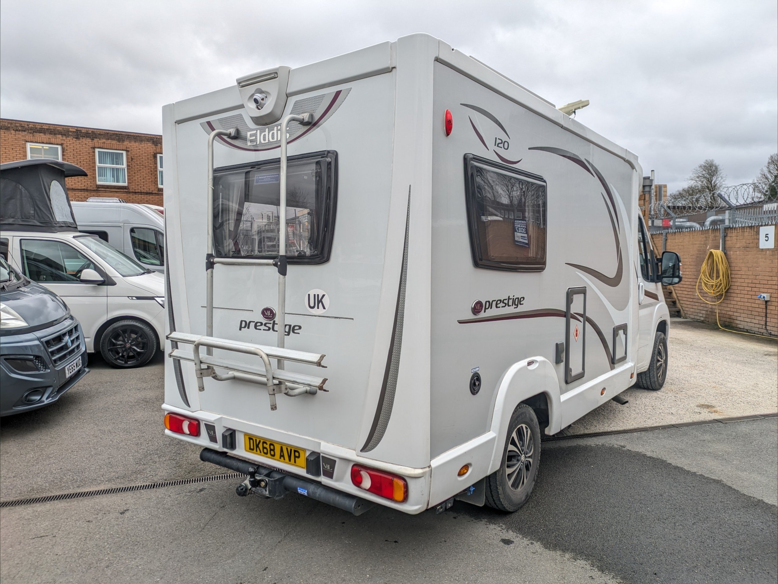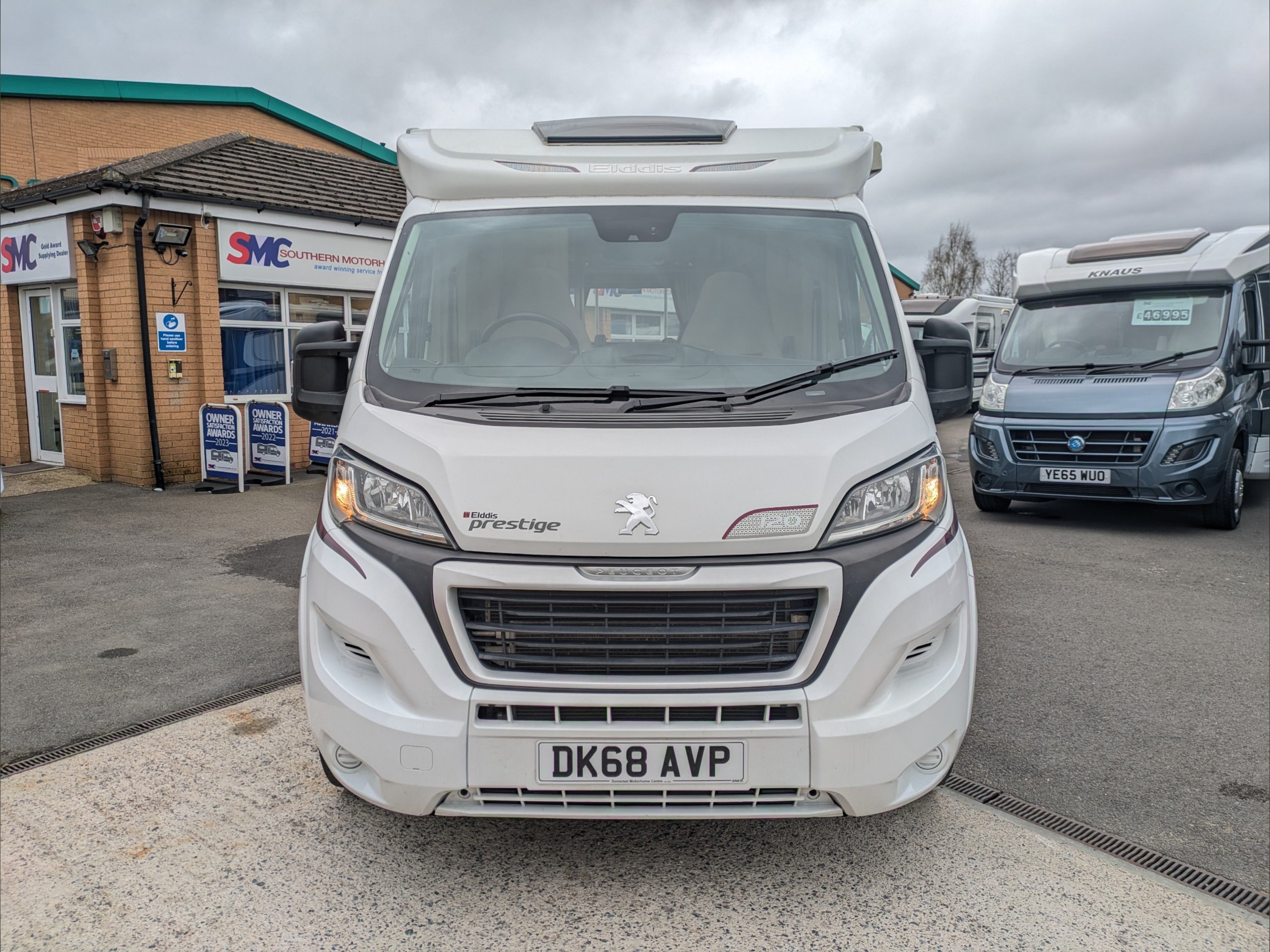 Elddis Prestige 120. 2 Berth, 2 Seatbelts. Standard Driving License Applicable. ULEZ Compliant. Situated at the rear, the versatile lounge can convert benches to U shaped, and converts to either twin single beds or a large double. The kitchen comes with extending counter tops, hob, sink, 3 way fridge, intergrill, and microwave. The washroom comes with shower, wash basin, and cassette toilet. Available at the Southern Motorhome Centre now.