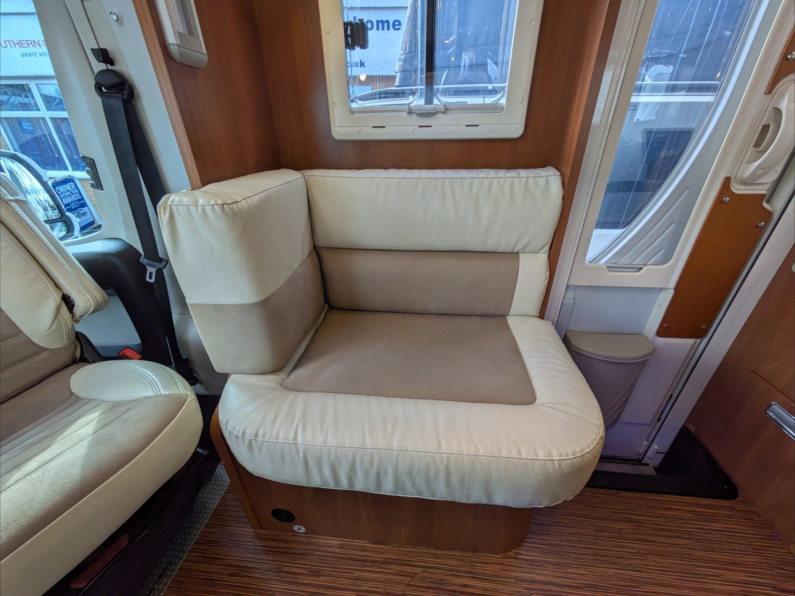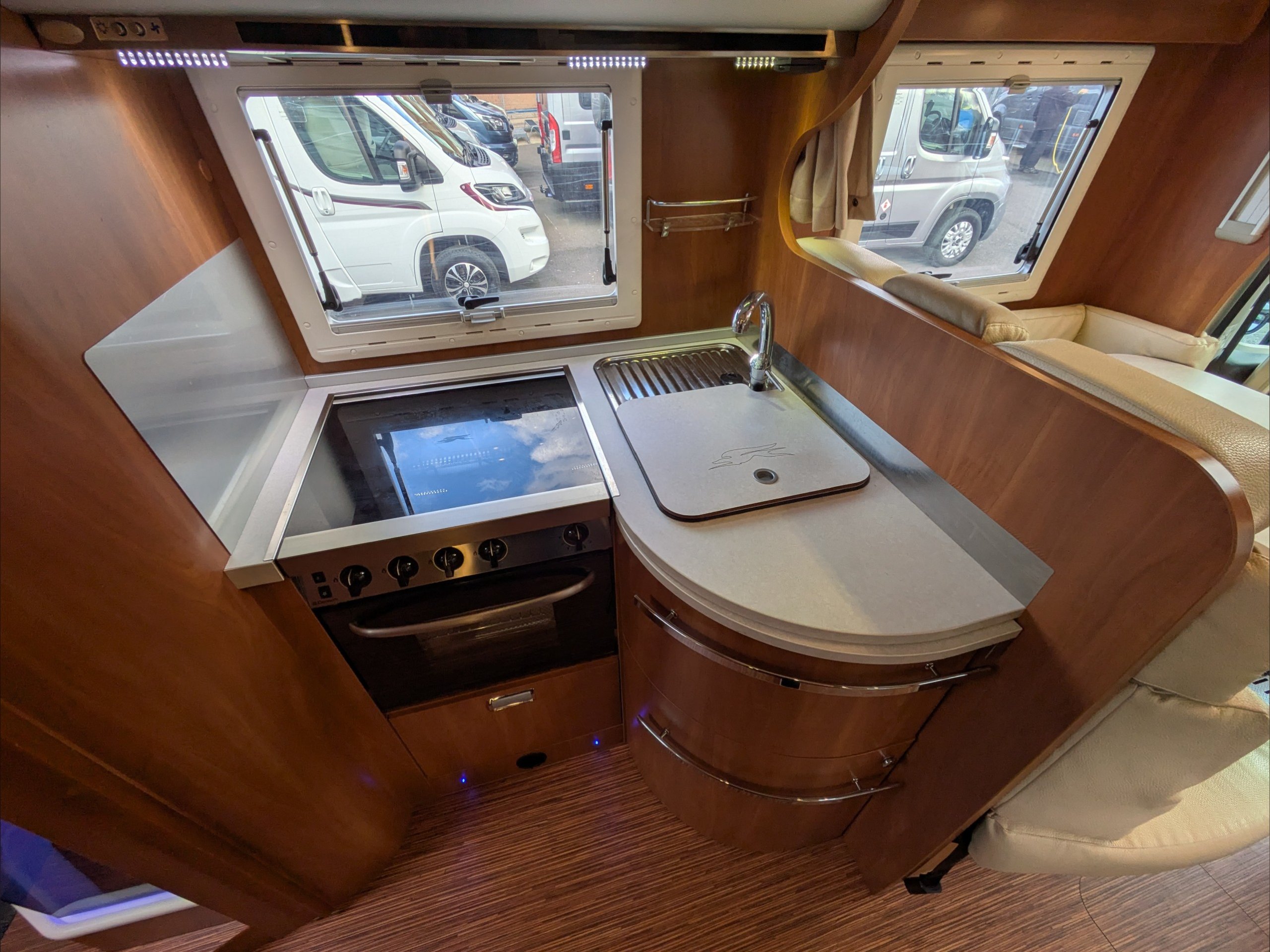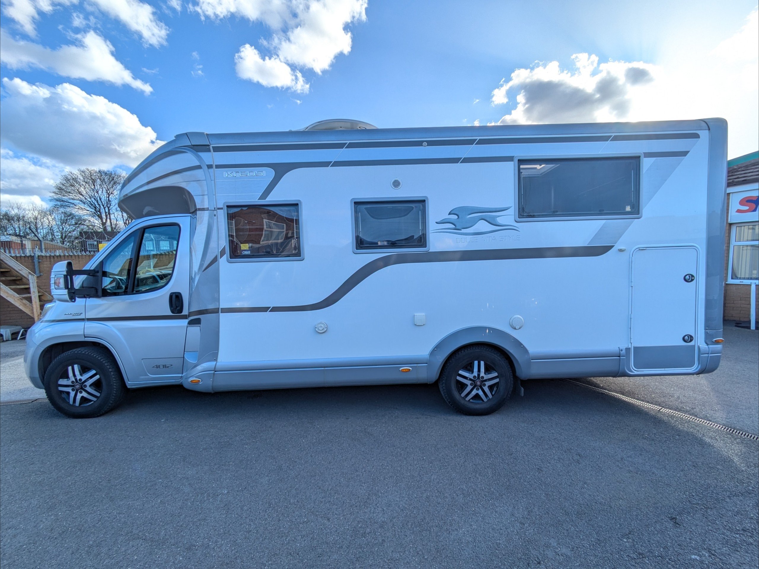 Laika Kreos 4012 Dolce Vita. 4 Berth, 4 Seatbelts. C1 License Required. ULEZ Compliant. Situated at the front, the dinette lounge can seat 5 people and has an electric drop down double bed above it. Situated at the rear is a fixed double island bed. The kitchen comes with 3 way fridge, separate freezer, hob, intergrill, sink, extractor fan, and microwave. The washroom comes with cassette toilet, wash basin, and separate shower. Available at the Southern Motorhome Centre now.