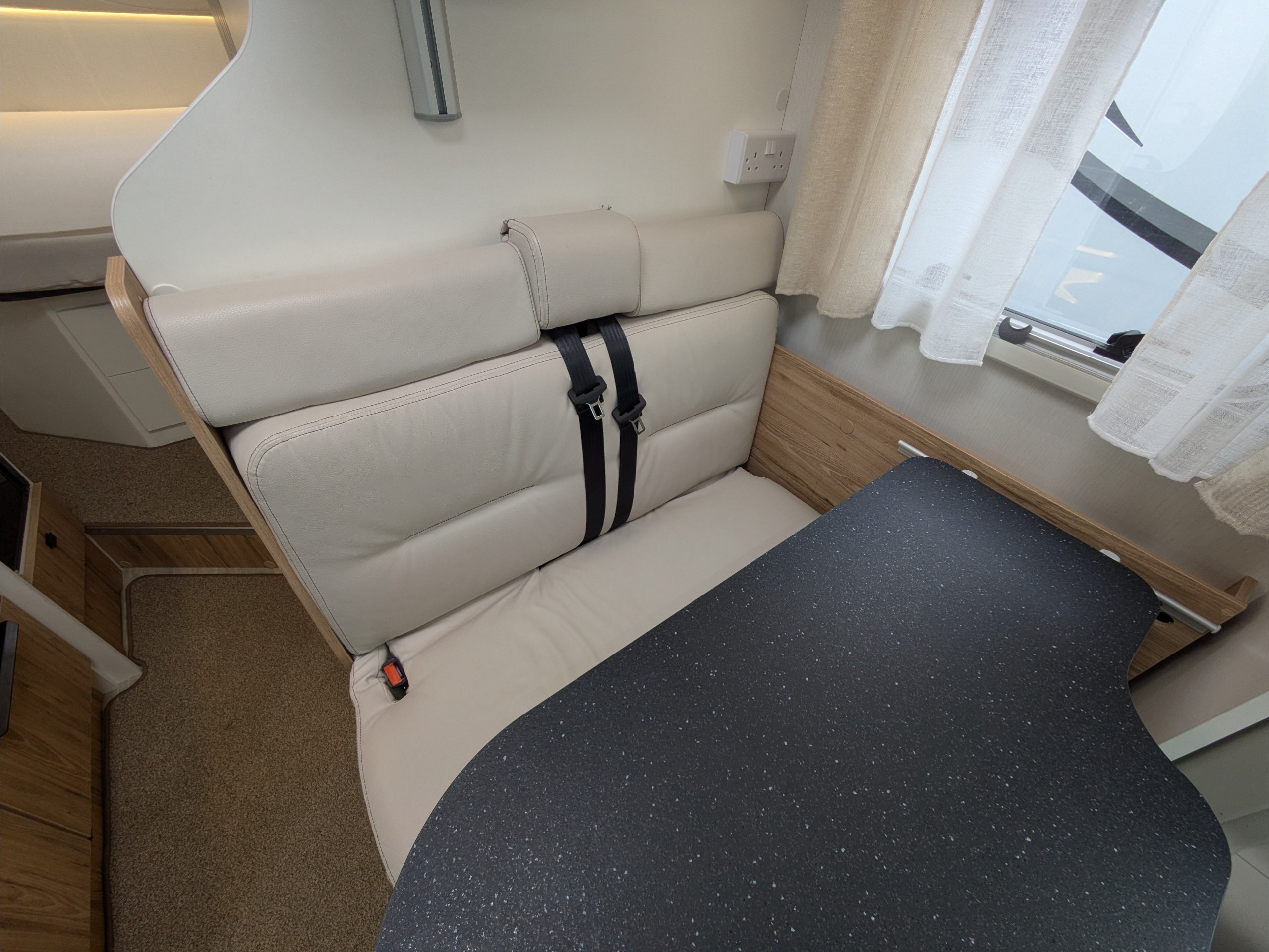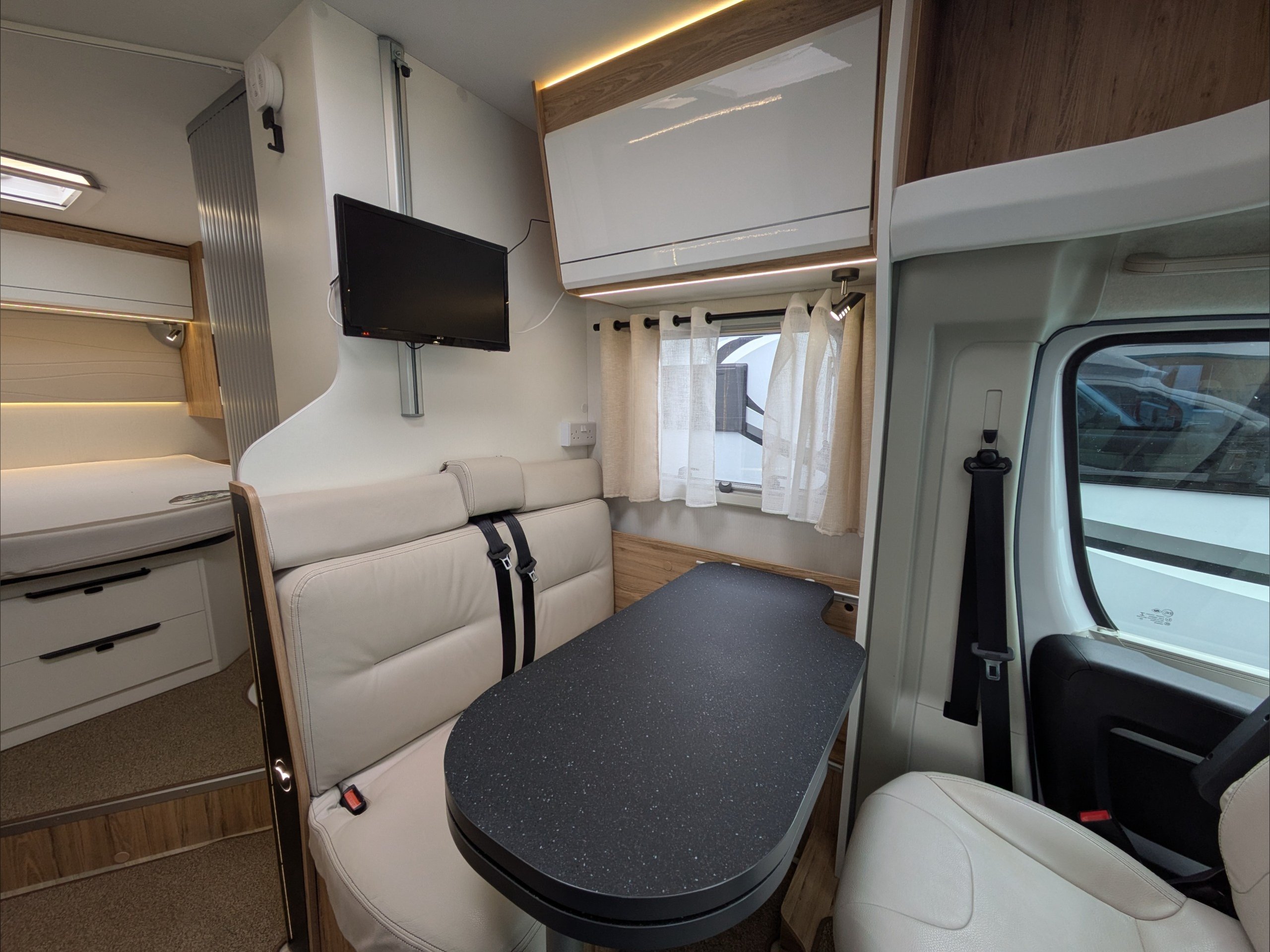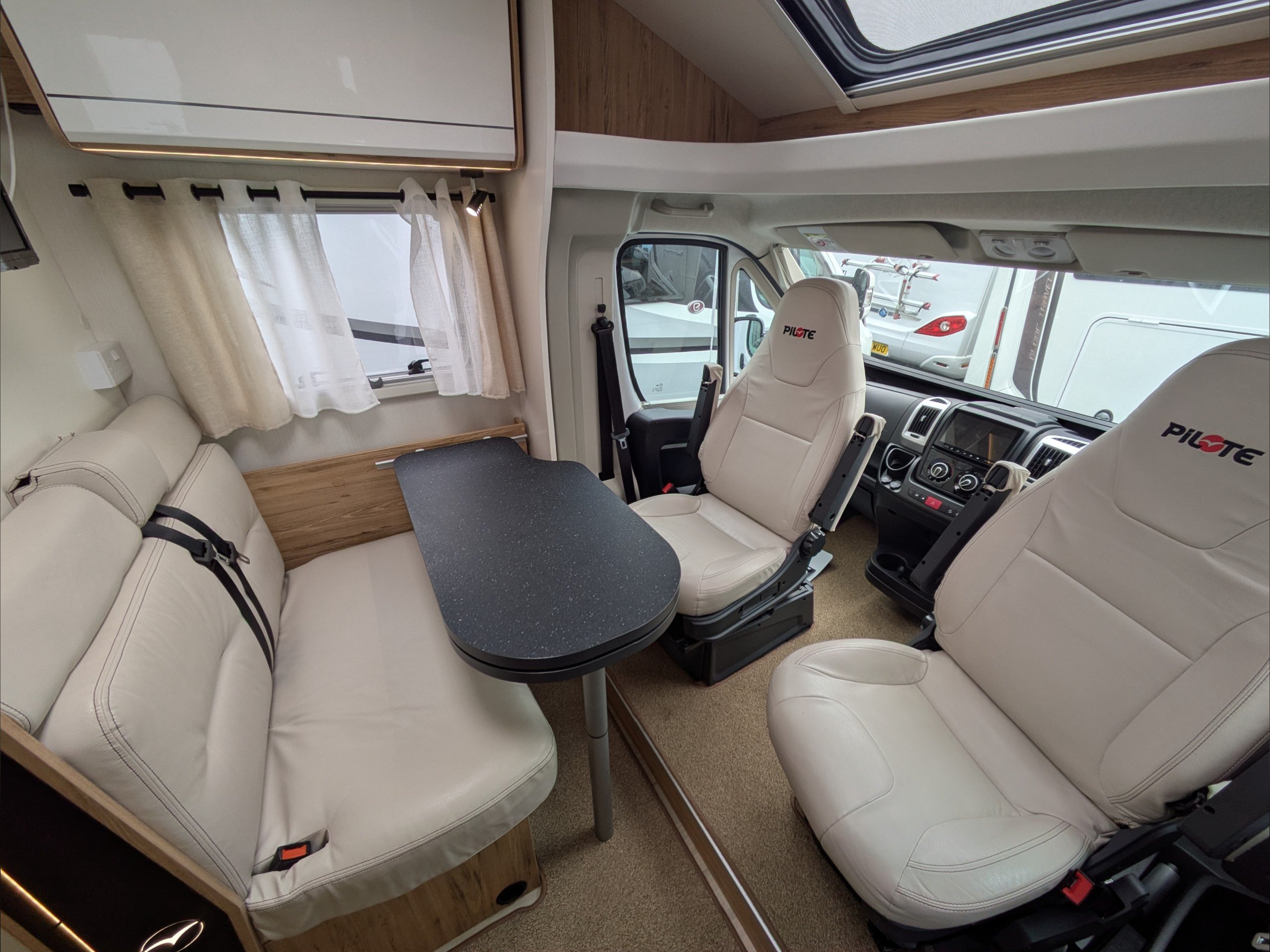 Pilote P650C Evidence. 3 Berth, 4 Seatbelts. ULEZ Compliant. Situated at the front, the dinette lounge can seat 4 people with the cab seats swiveled and converts to a single bed. Situated at the rear is a fixed island bed with storage underneath. The kitchen comes with a large 3 way fridge, hob, sink, and intergrill. The washroom comes with hand basin, cassette toilet, and separate shower. Available at the Southern Motorhome Centre now.