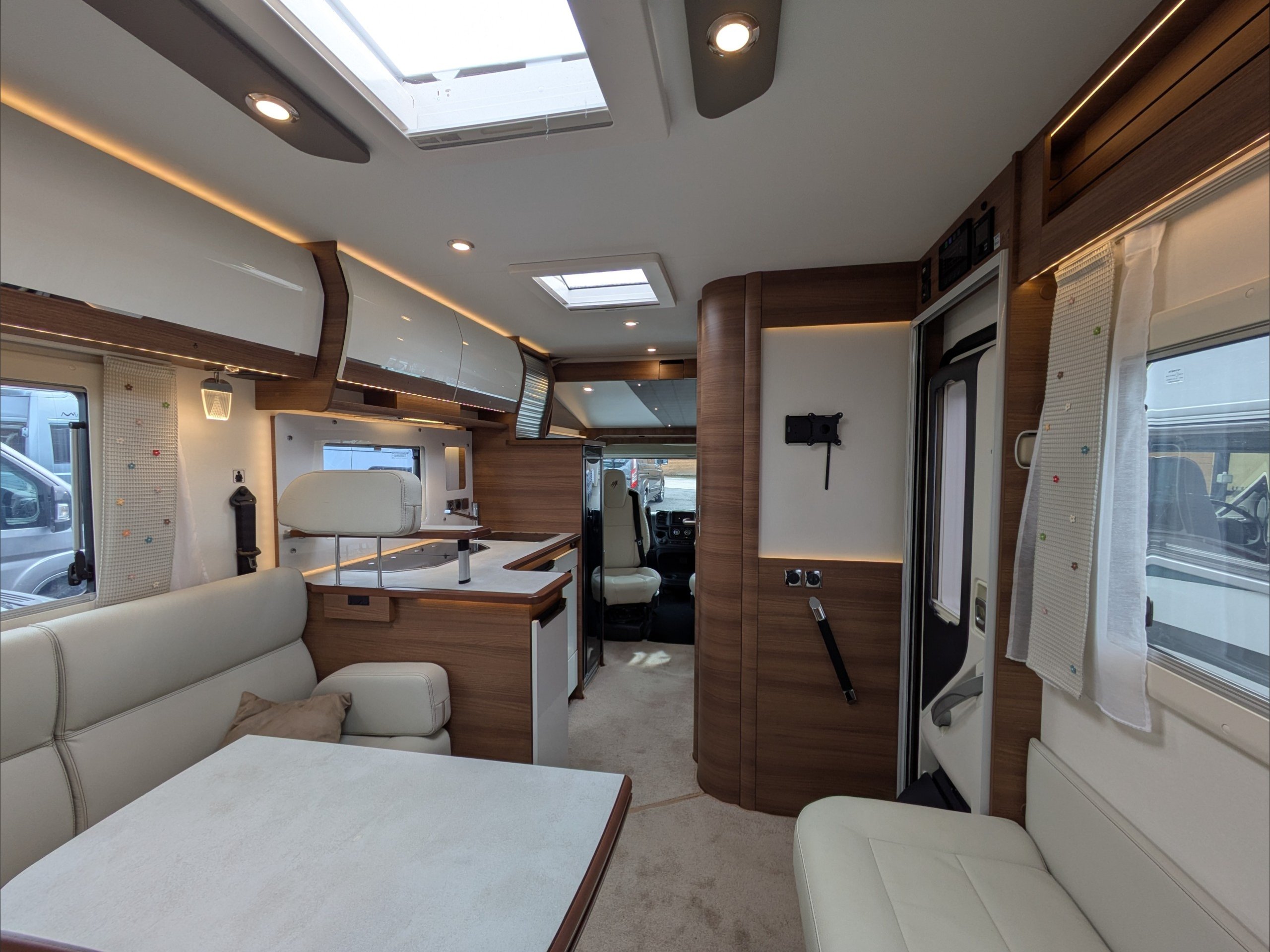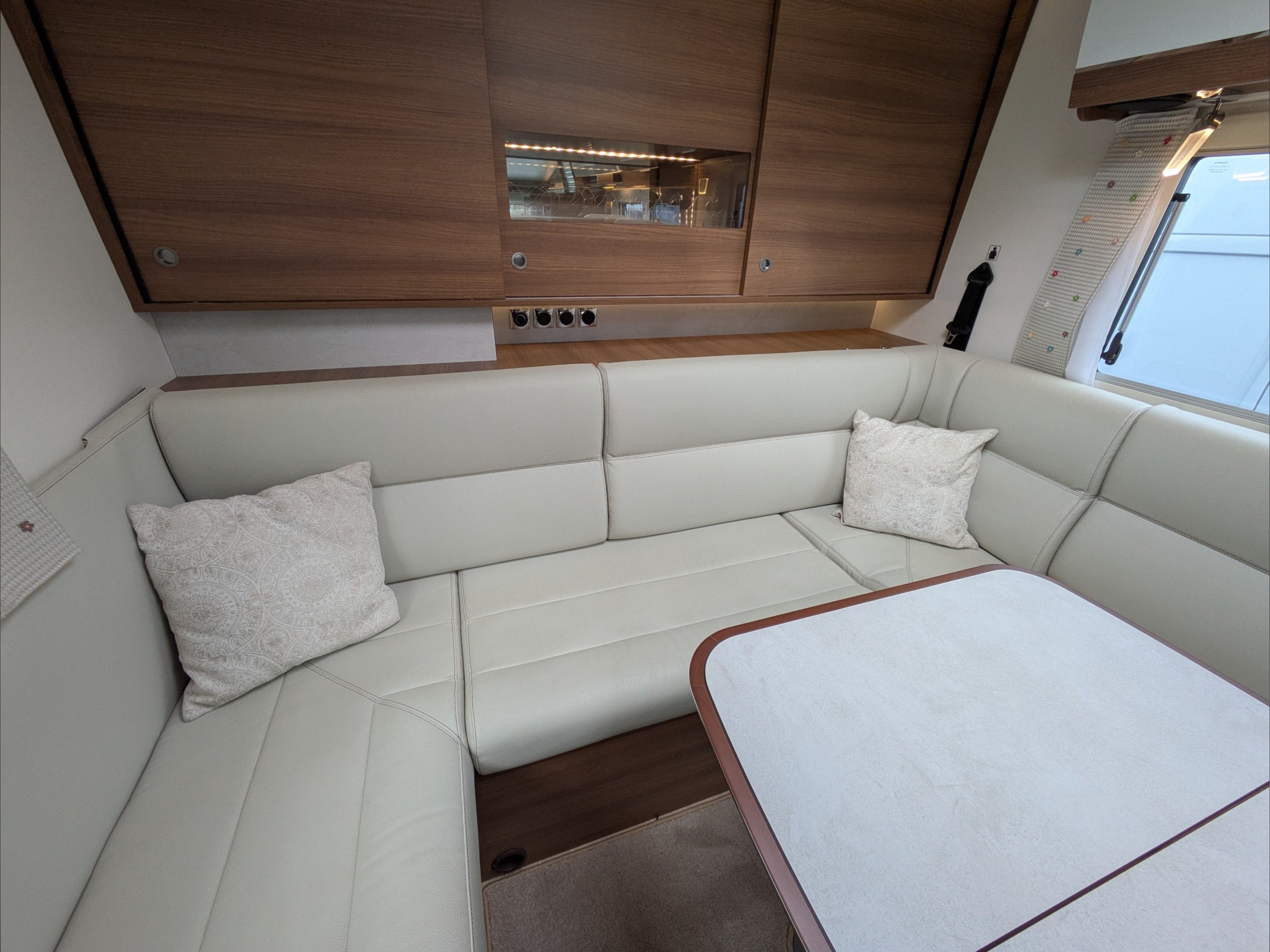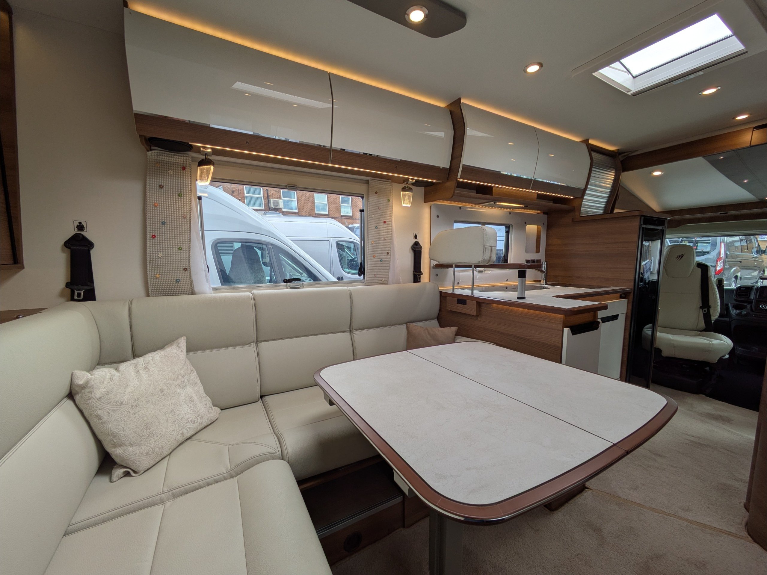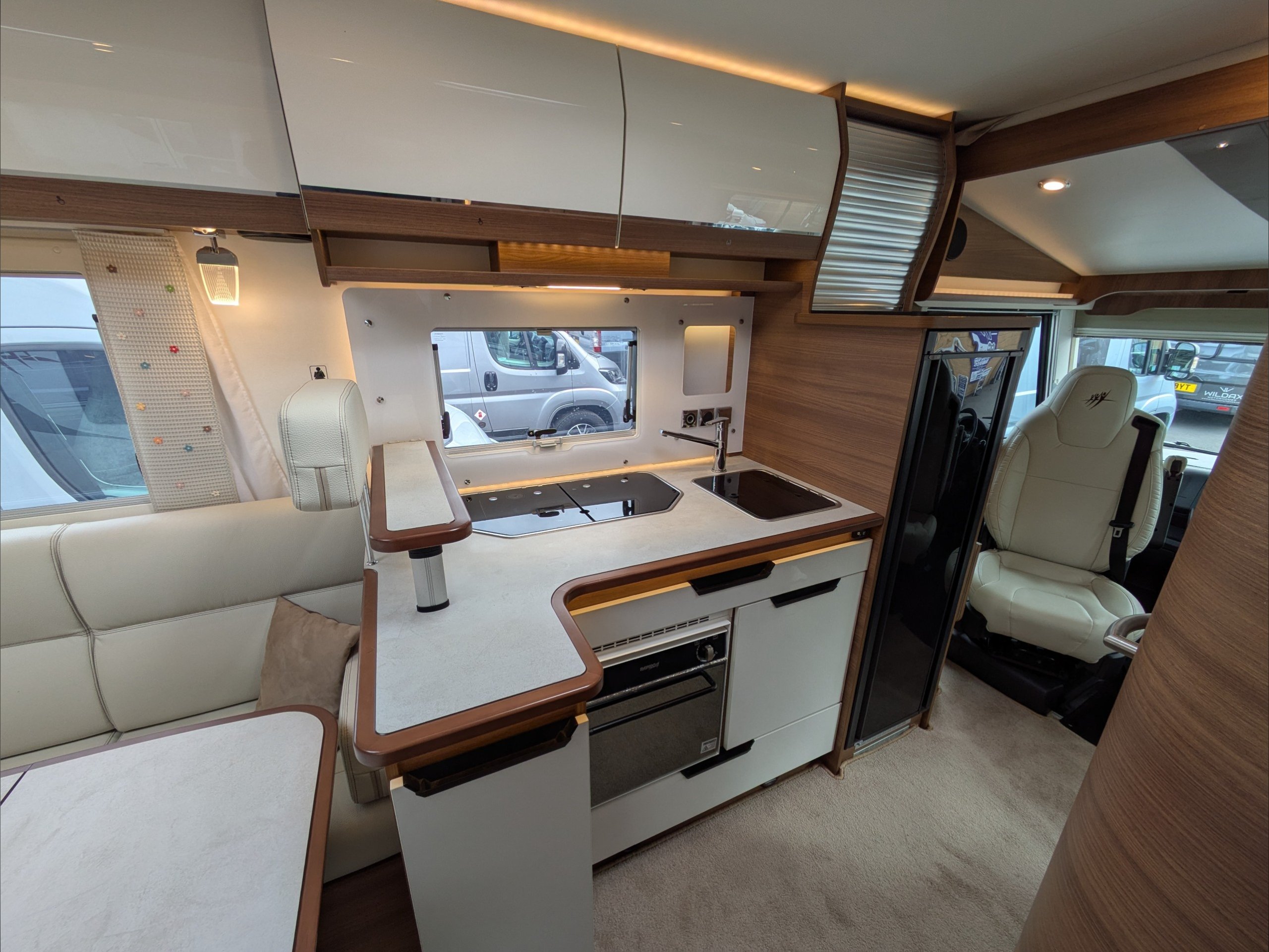Rapido 854F. 4 Berth, 4 Seatbelts. C1 License Required. ULEZ Compliant. Situated at the rear, the U Shaped lounge can seat 6 people and converts to a double bed. Over the cab is a drop down double bed. The kitchen comes with intergrill, hob, sink, 3 way fridge, and extractor fan. The washroom comes with cassette toilet, wash basin, and swing wall separate shower. Available at the Southern Motorhome Centre now.