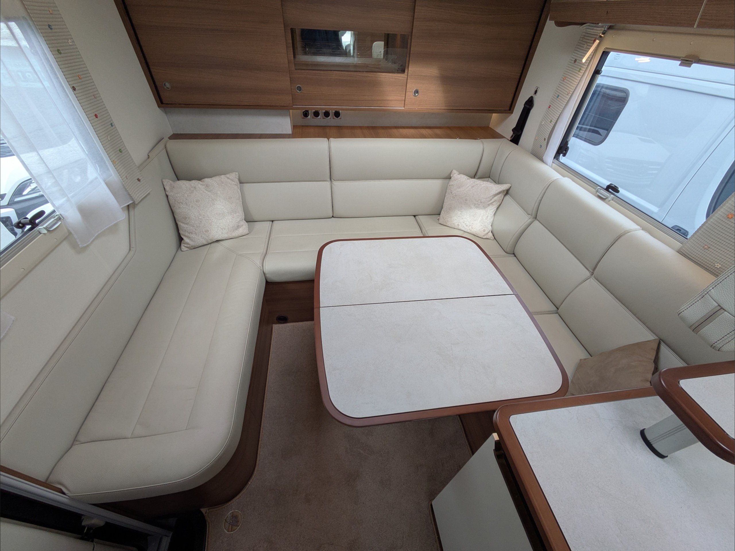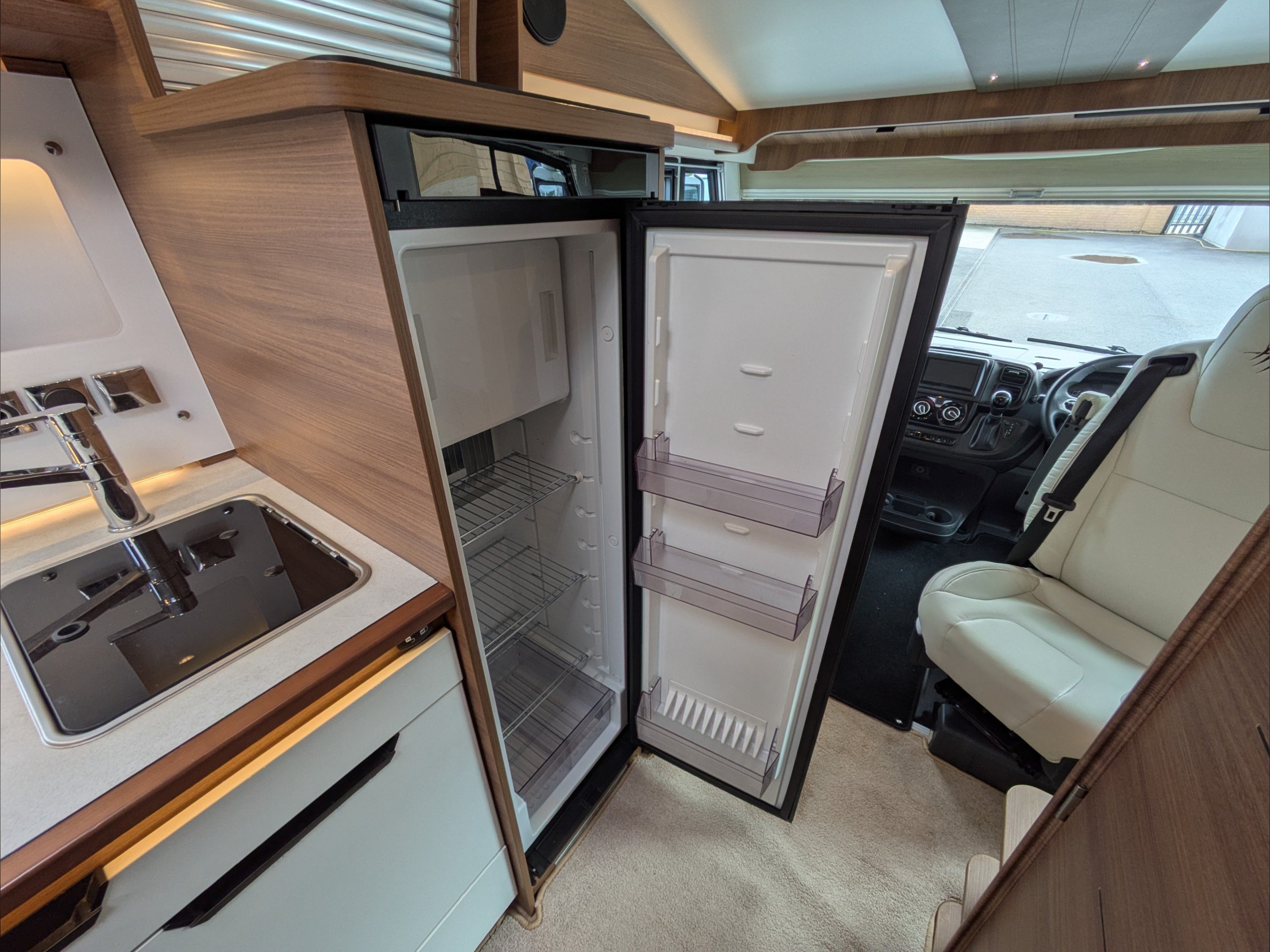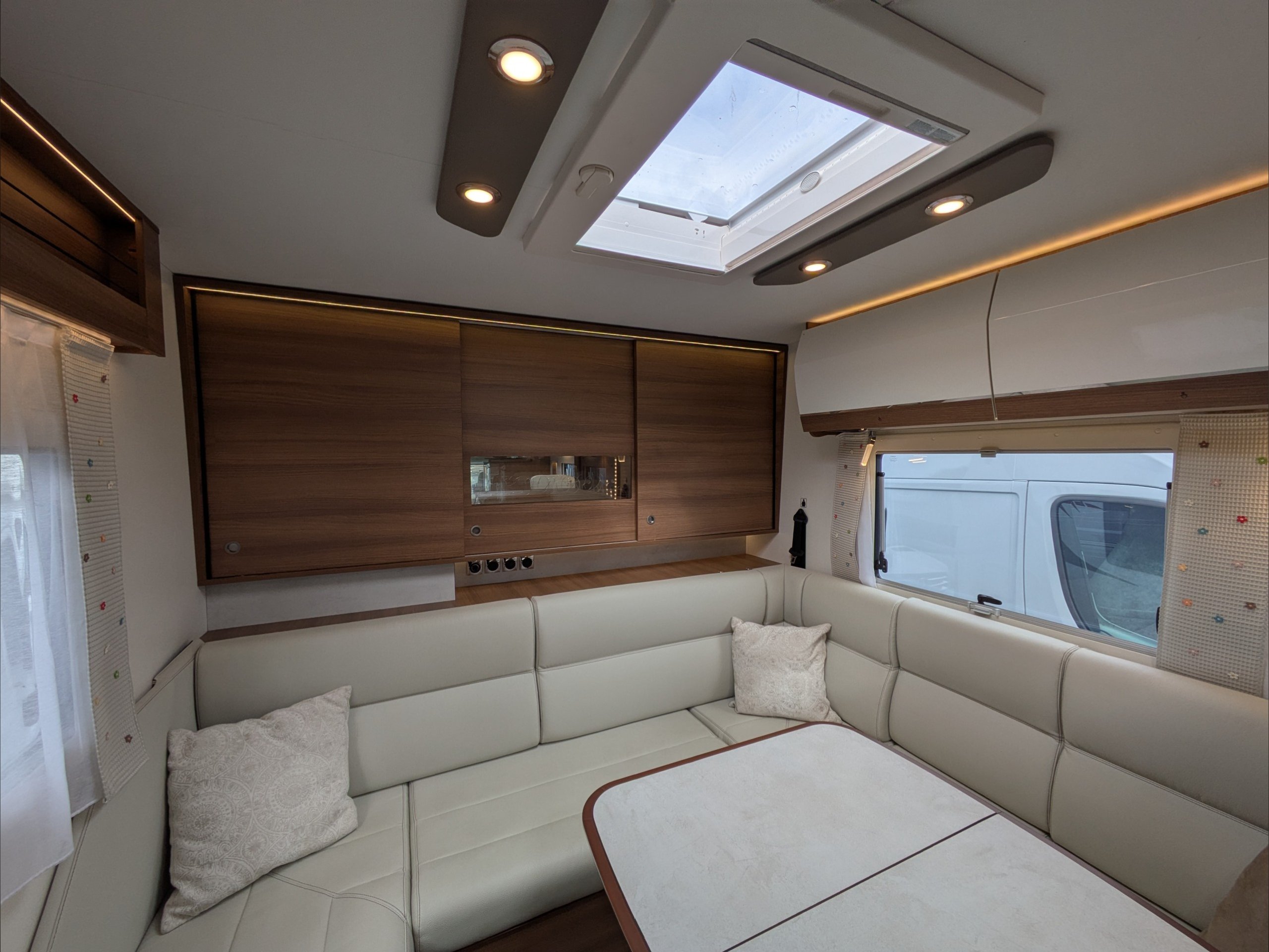 Rapido 854F. 4 Berth, 4 Seatbelts. C1 License Required. ULEZ Compliant. Situated at the rear, the U Shaped lounge can seat 6 people and converts to a double bed. Over the cab is a drop down double bed. The kitchen comes with intergrill, hob, sink, 3 way fridge, and extractor fan. The washroom comes with cassette toilet, wash basin, and swing wall separate shower. Available at the Southern Motorhome Centre now.