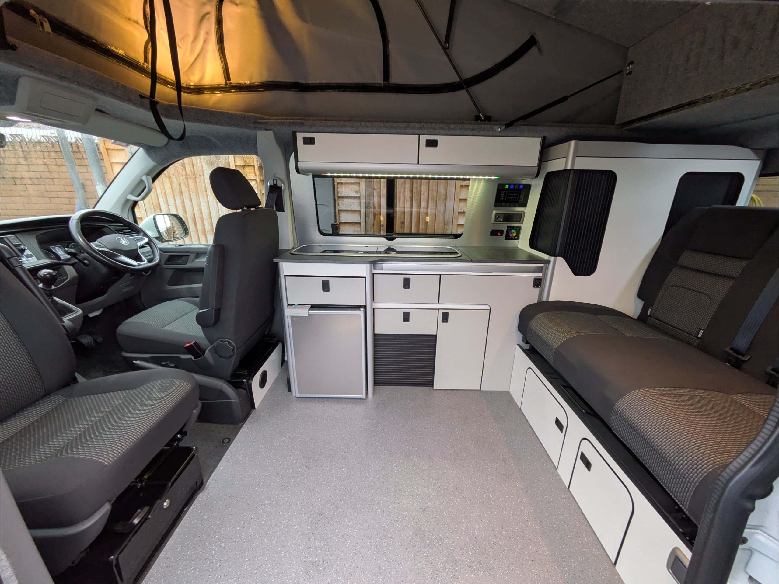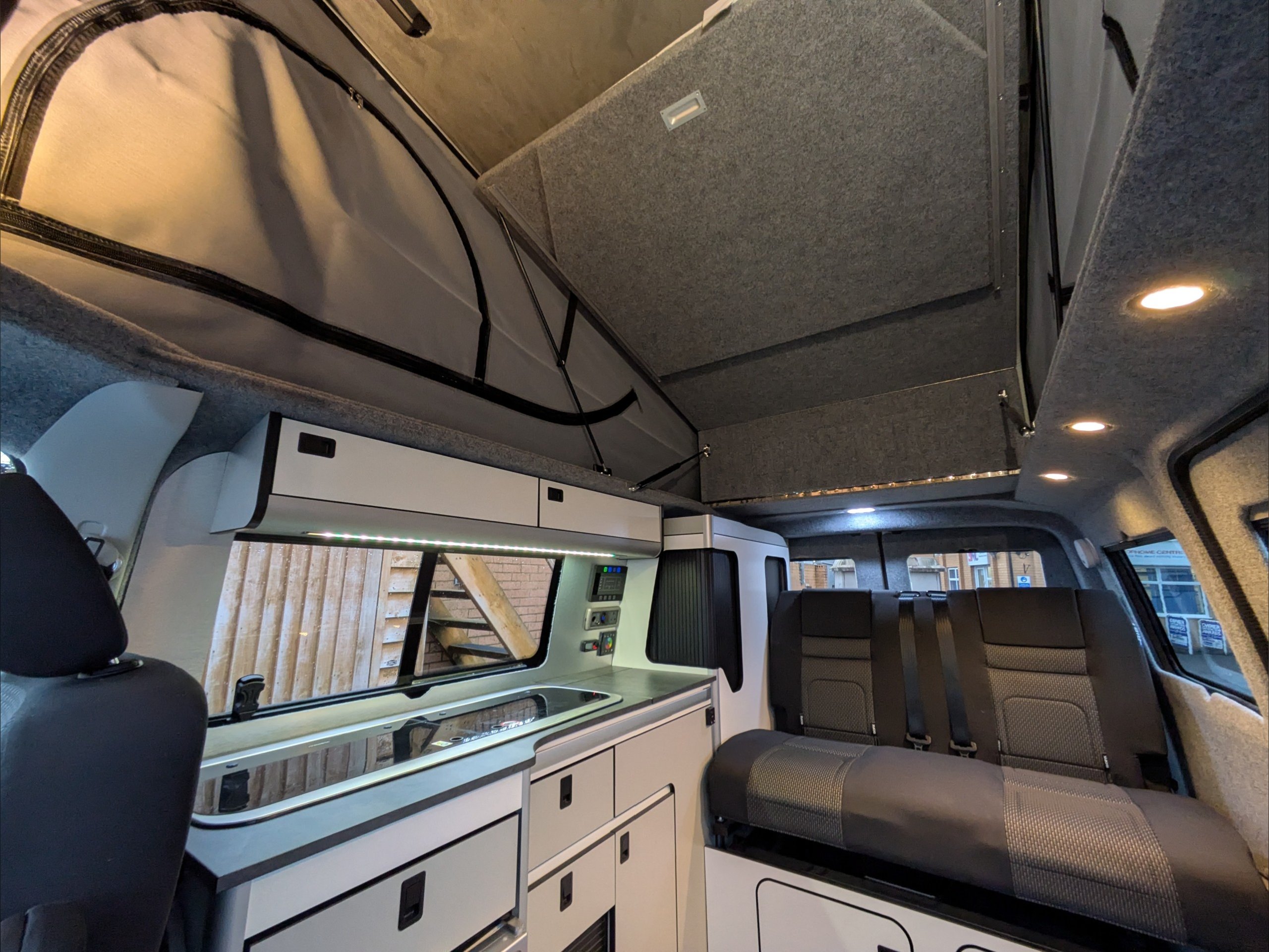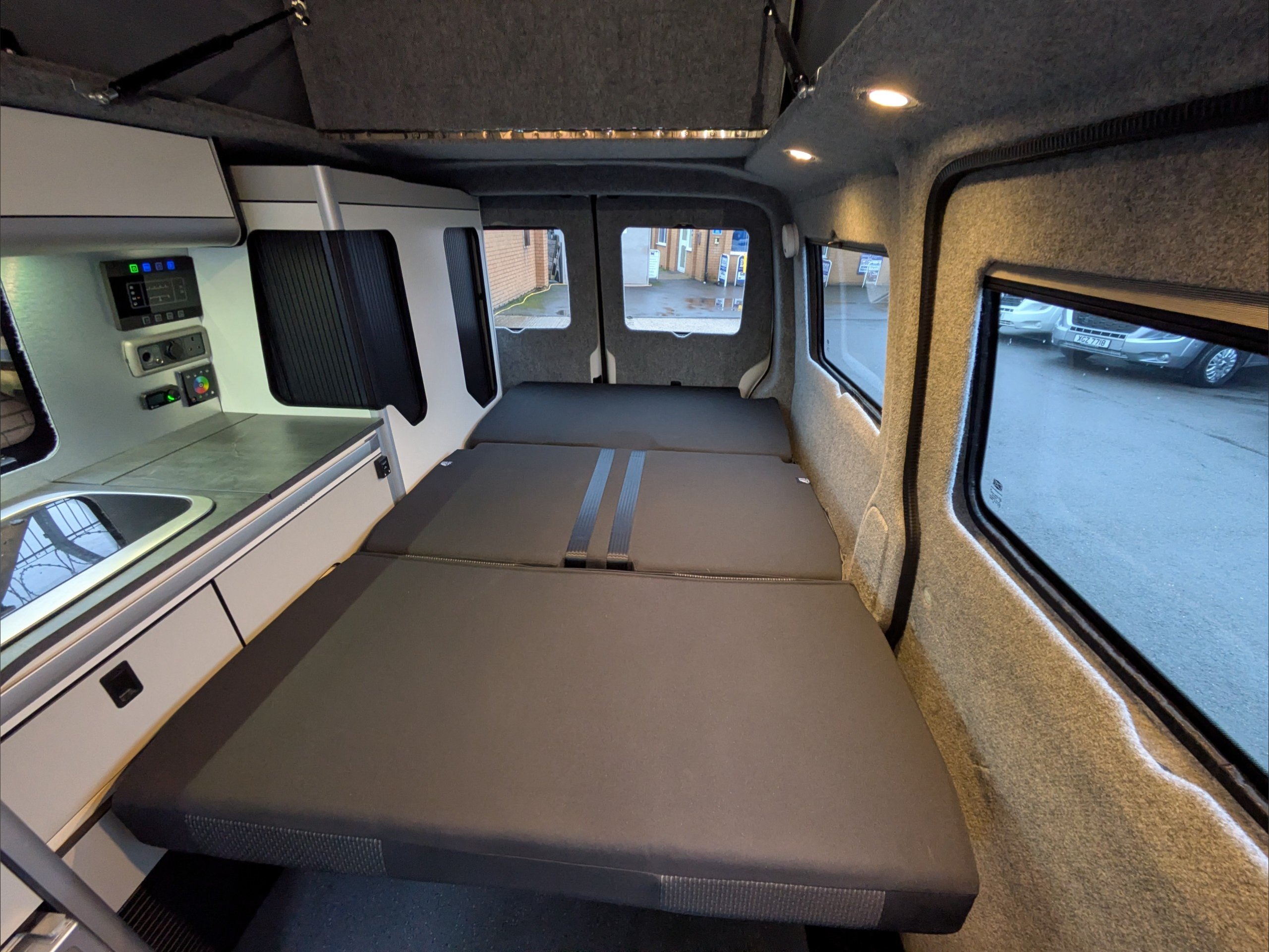 Staycation Coastline. 4 Berth, 4 Seatbelts. Standard Driving License Applicable. ULEZ Compliant. Situated in the bulk of the inside of the vehicle, the rear RIB seat of the lounge converts to a double bed. Above the lounge in the pop top is a second double bed which can fold up out of the way. The kitchen comes with fridge, sink, and hob. Available at the Southern Motorhome Centre now.