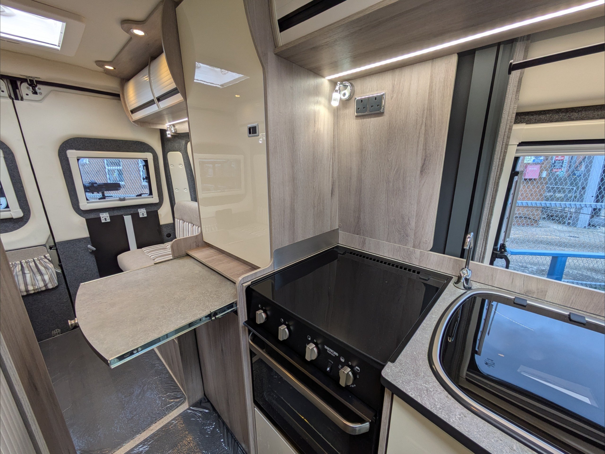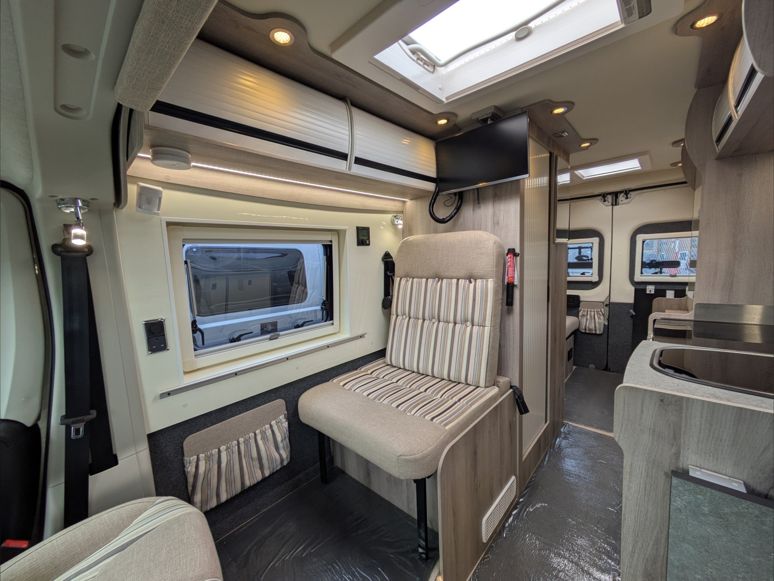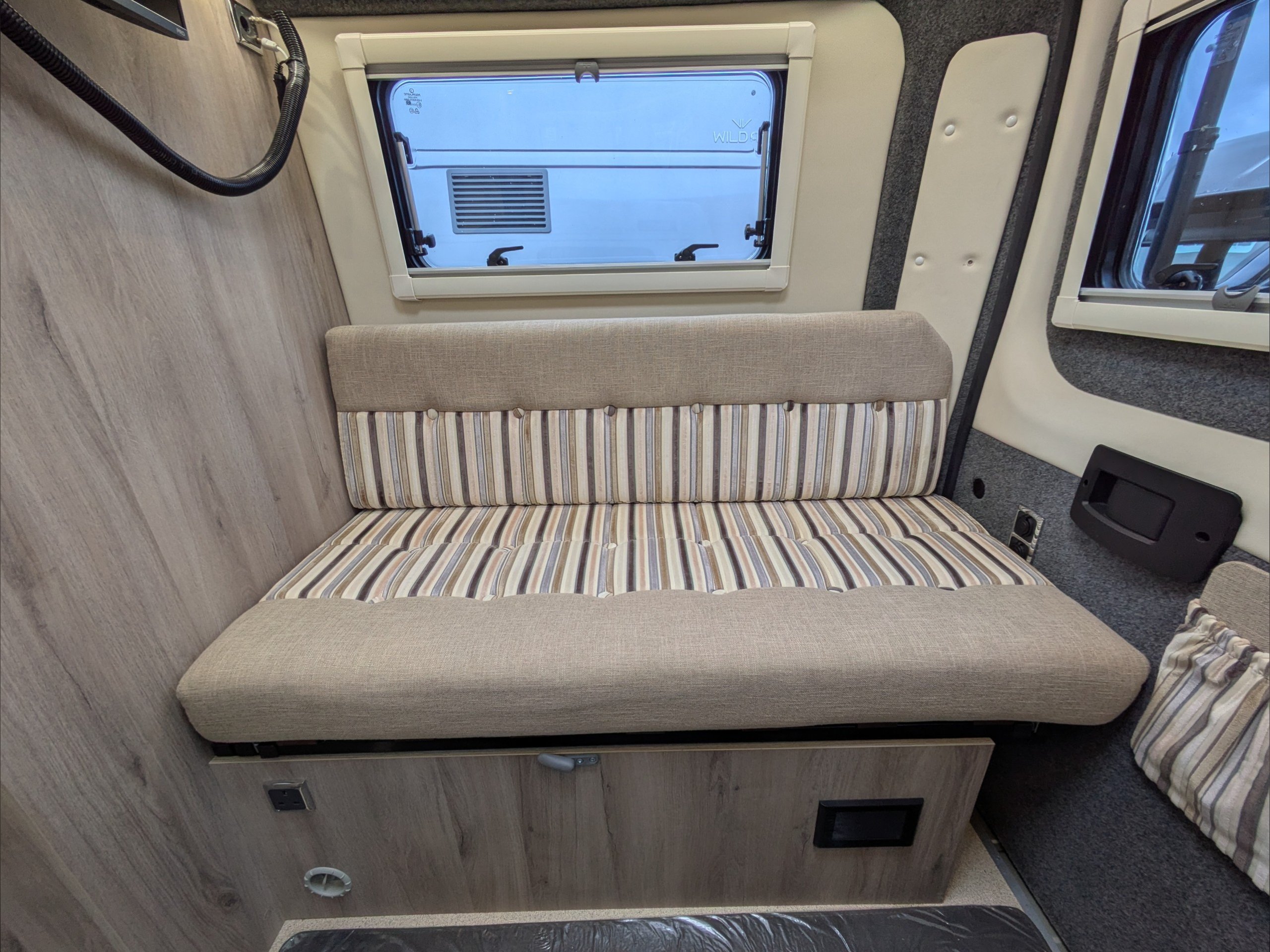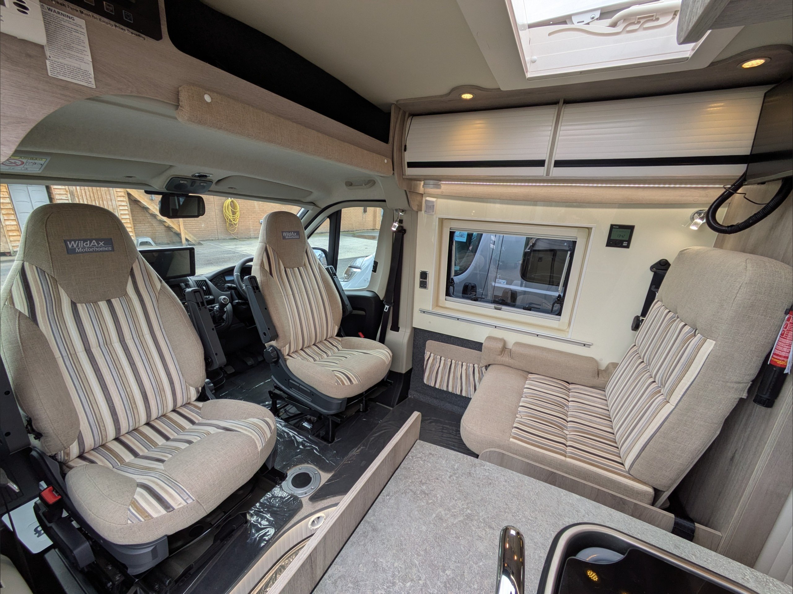 WildAx Aurora Leisure. 3 Berth, 3 Seatbelts. Standard Driving License Applicable. ULEZ Compliant. Situated at the front, the dinette conversion lounge can seat 3 people with the cab seats swiveled. Situated at the rear, the lounge comprises dual bench seats, which convert to a double bed. The kitchen comes with intergrill, fridge, hob, and extending counter top. The washroom comes with shower, wash basin, and cassette toilet. Available now at the Southern Motorhome Centre.