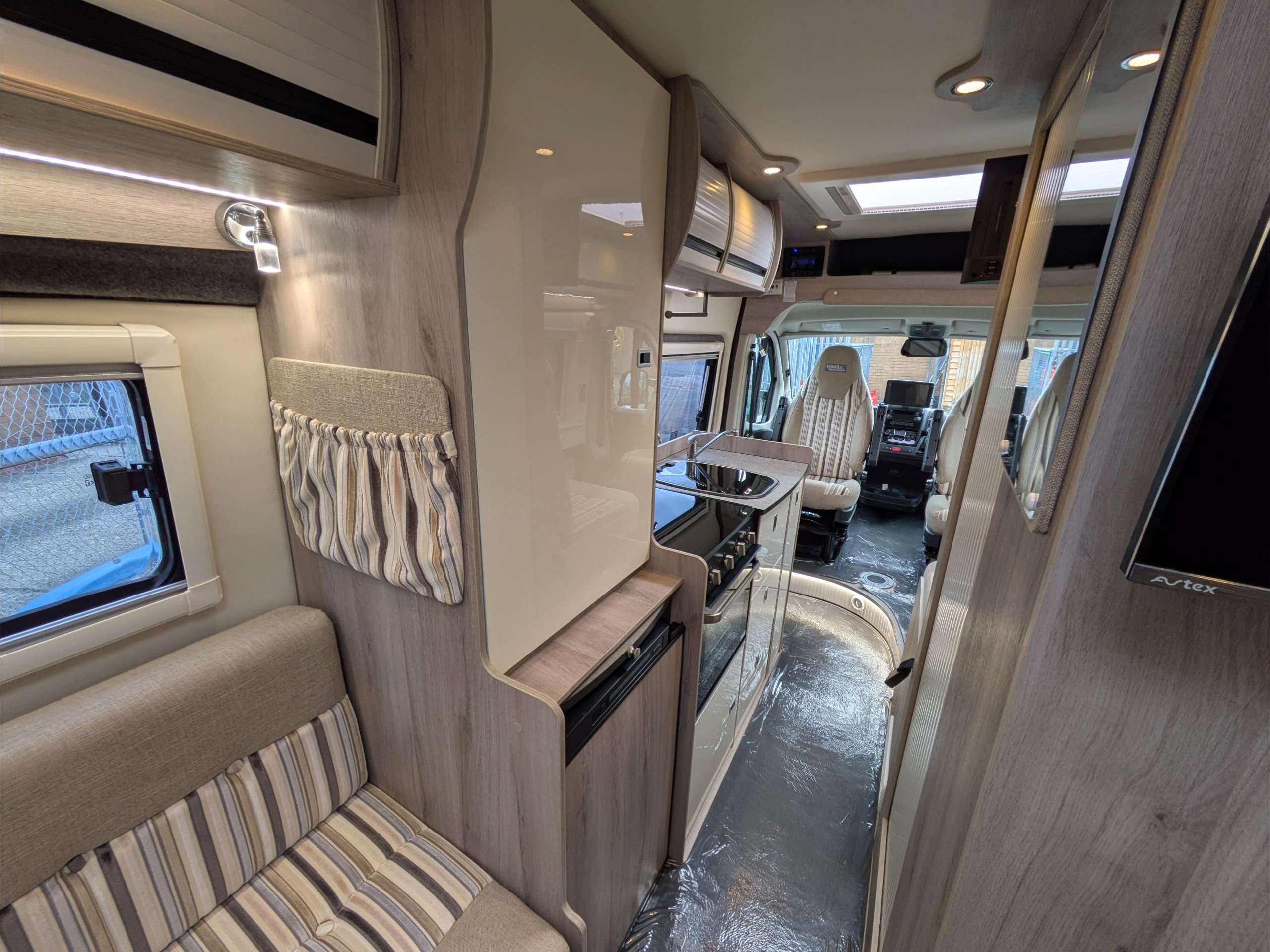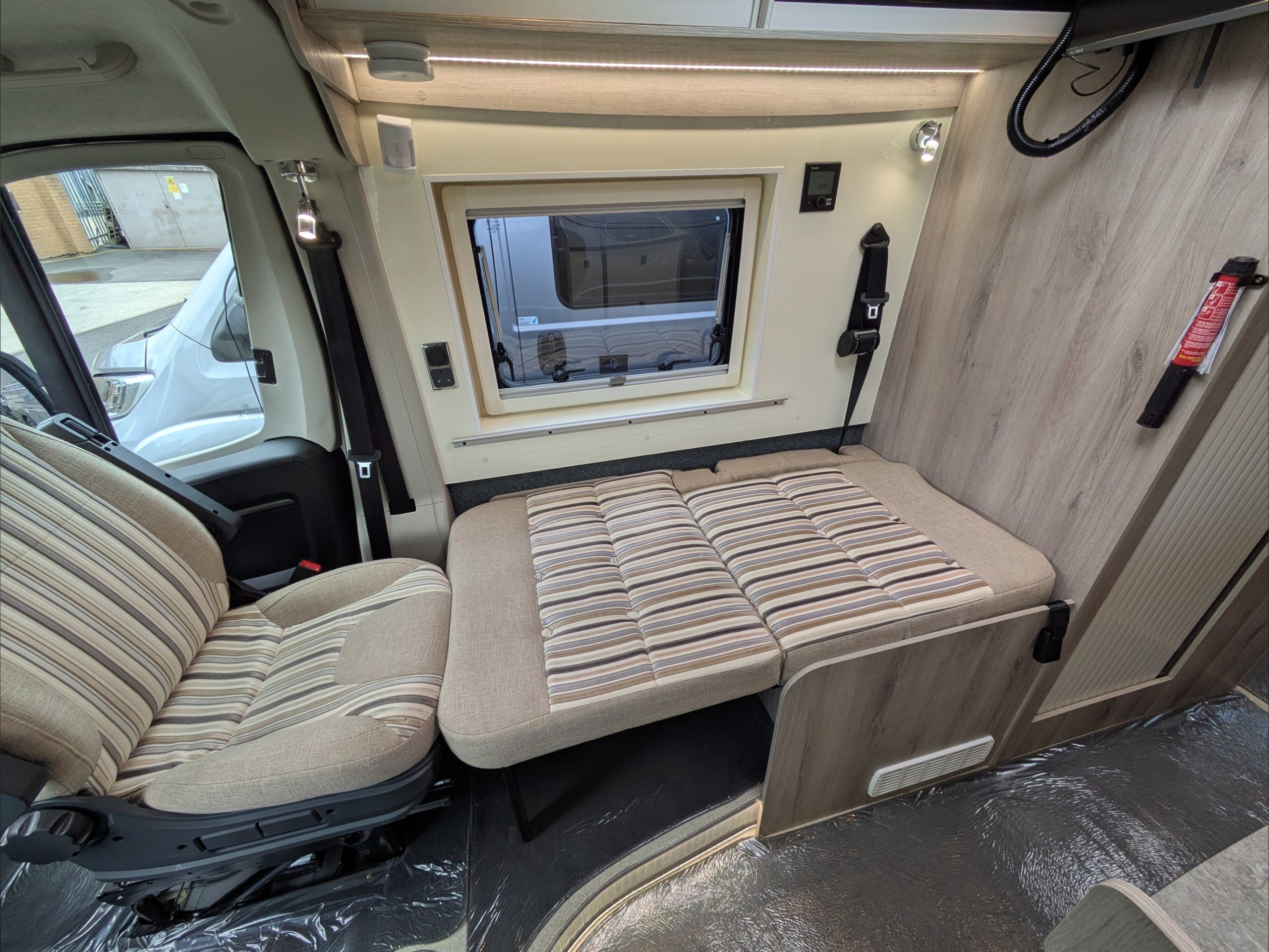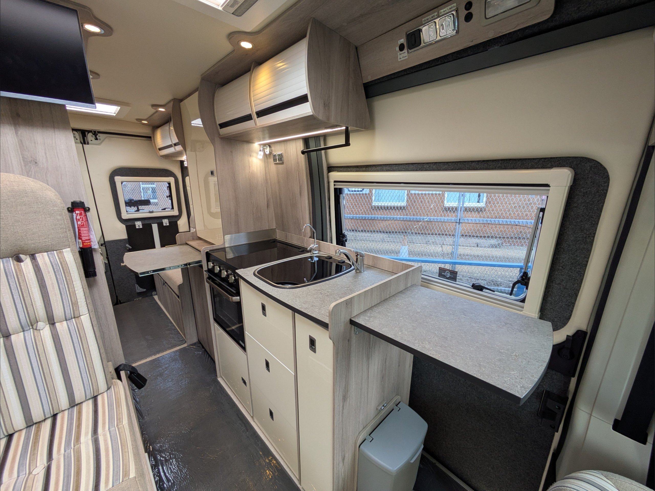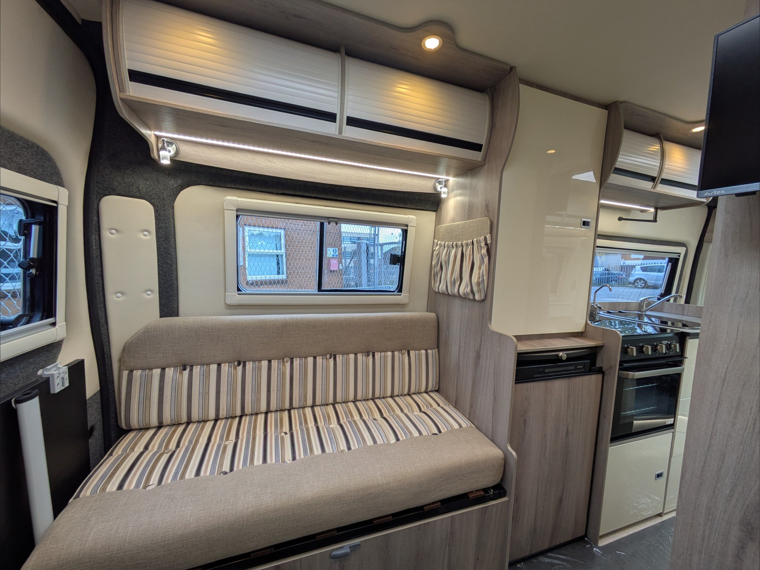 WildAx Aurora Leisure. 3 Berth, 3 Seatbelts. Standard Driving License Applicable. ULEZ Compliant. Situated at the front, the dinette conversion lounge can seat 3 people with the cab seats swiveled. Situated at the rear, the lounge comprises dual bench seats, which convert to a double bed. The kitchen comes with intergrill, fridge, hob, and extending counter top. The washroom comes with shower, wash basin, and cassette toilet. Available now at the Southern Motorhome Centre.