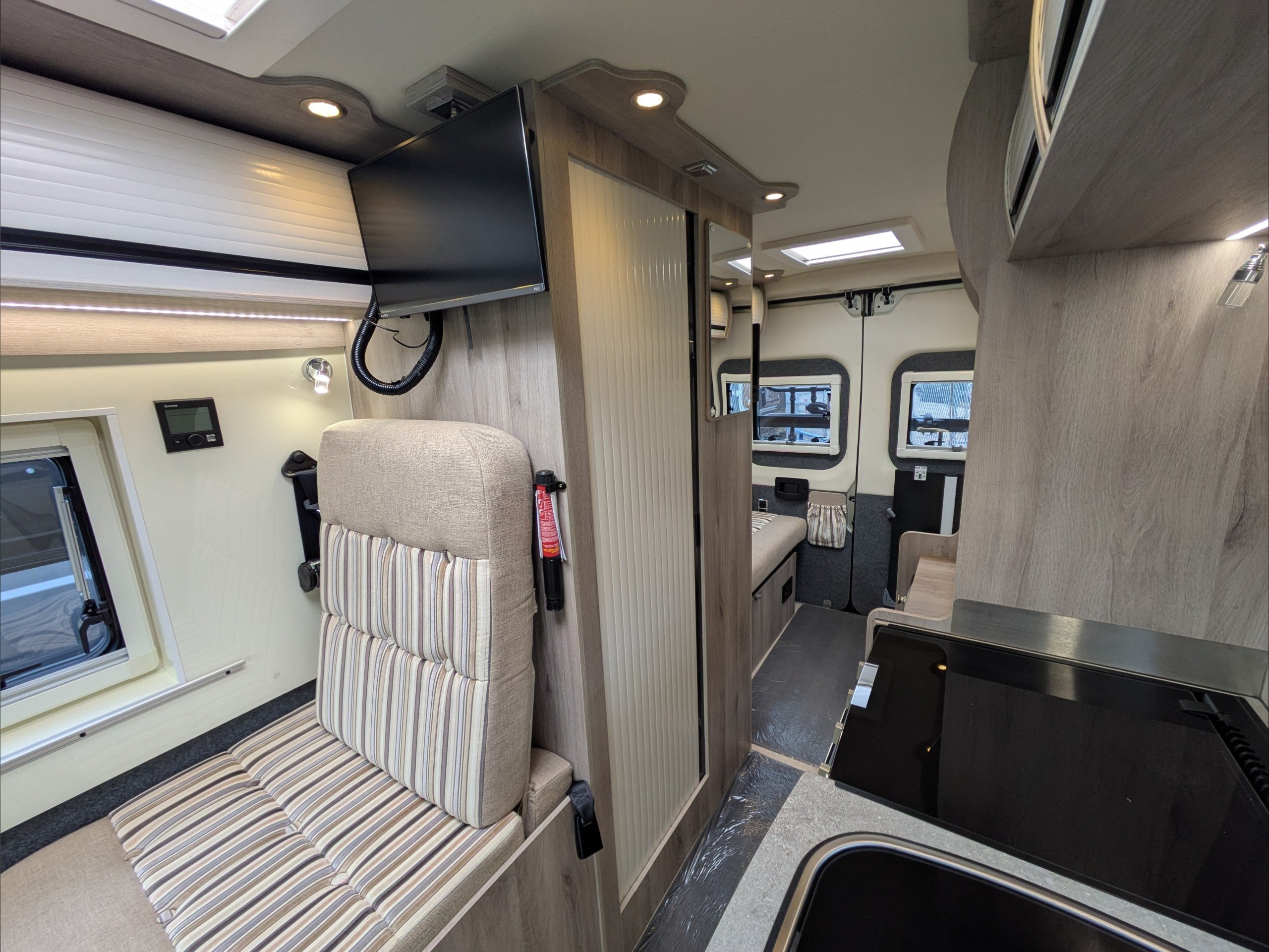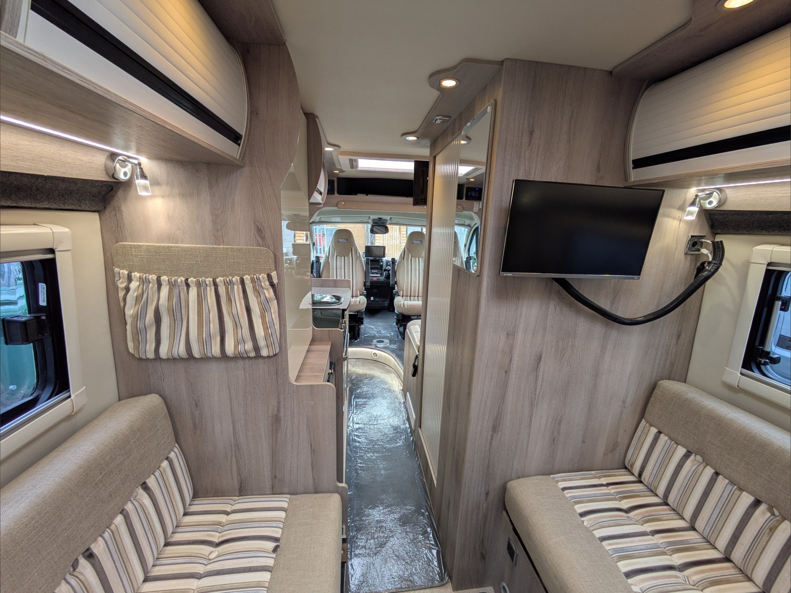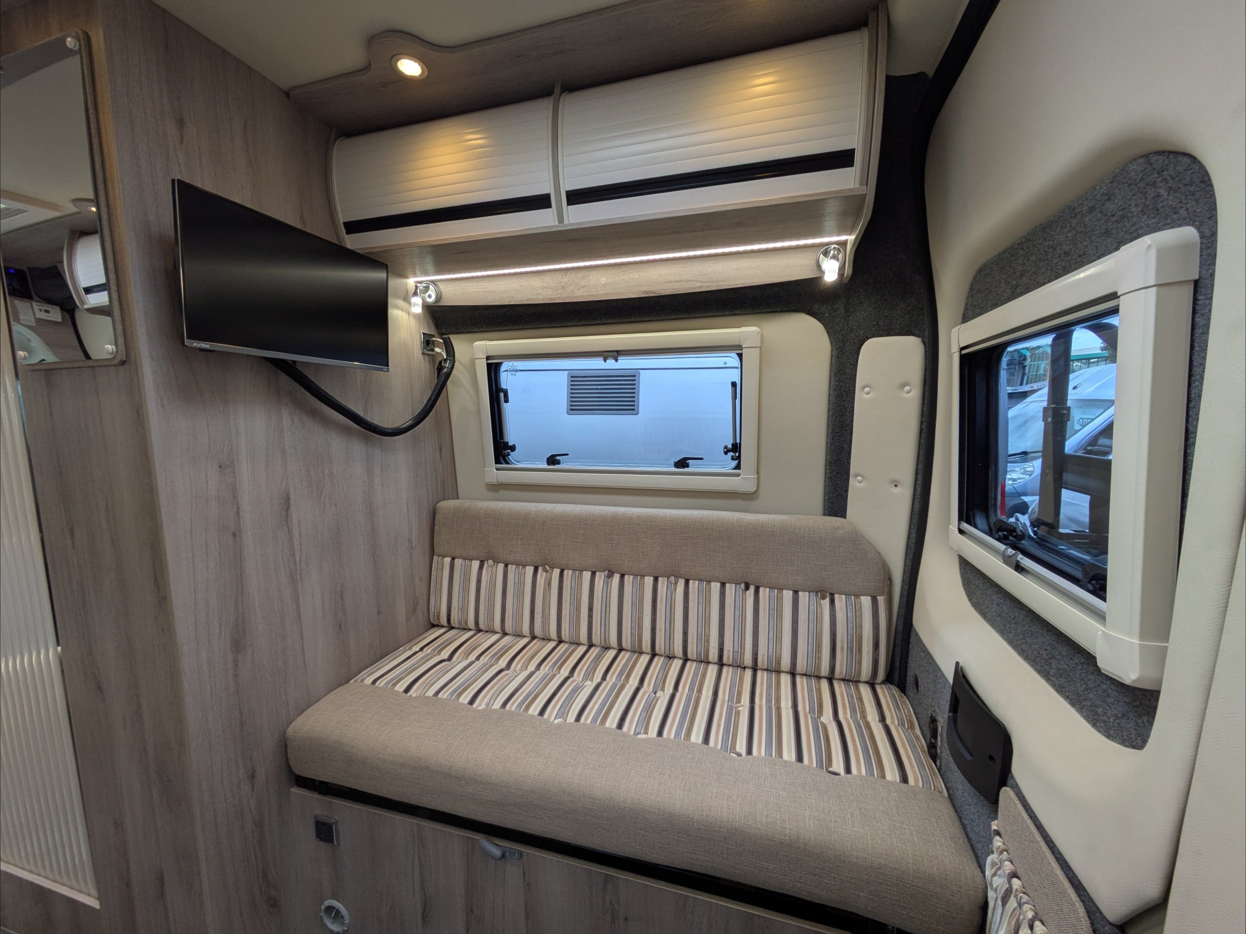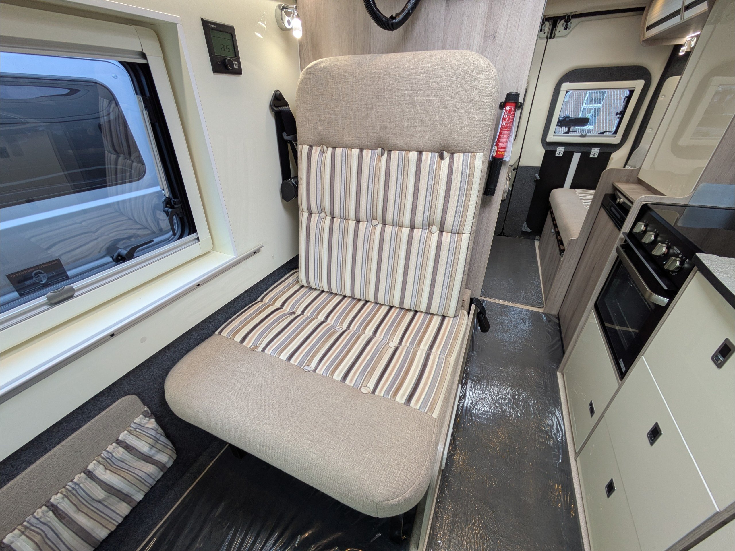 WildAx Aurora Leisure. 3 Berth, 3 Seatbelts. Standard Driving License Applicable. ULEZ Compliant. Situated at the front, the dinette conversion lounge can seat 3 people with the cab seats swiveled. Situated at the rear, the lounge comprises dual bench seats, which convert to a double bed. The kitchen comes with intergrill, fridge, hob, and extending counter top. The washroom comes with shower, wash basin, and cassette toilet. Available now at the Southern Motorhome Centre.