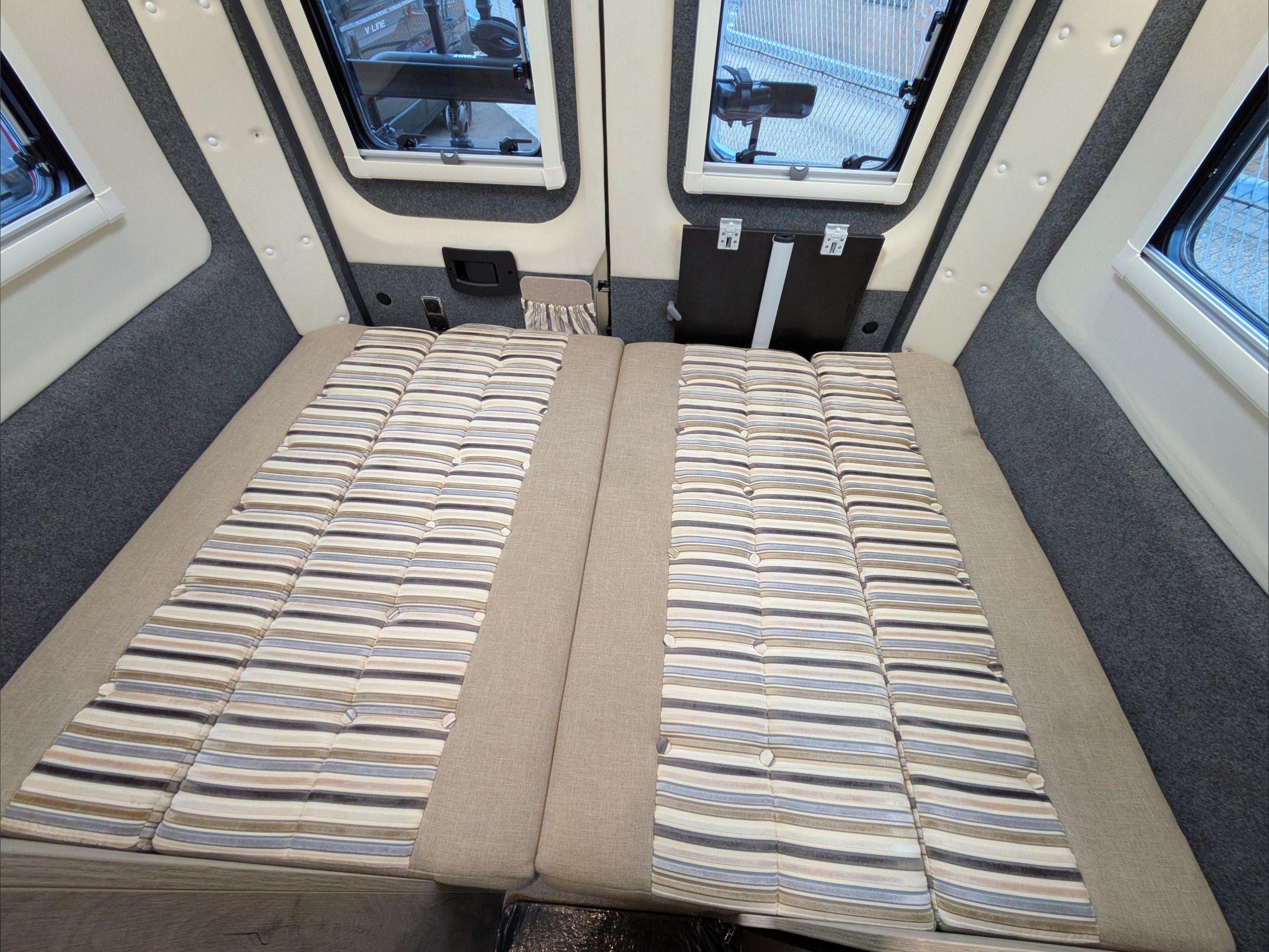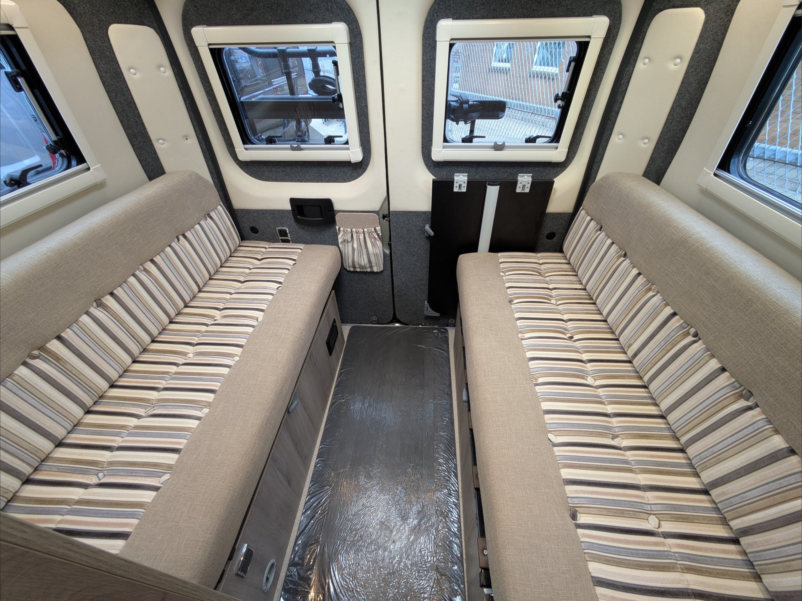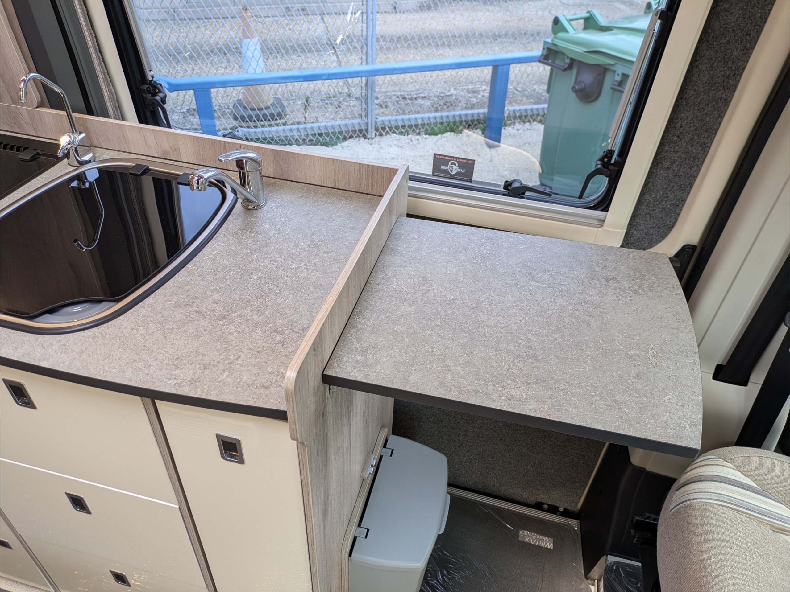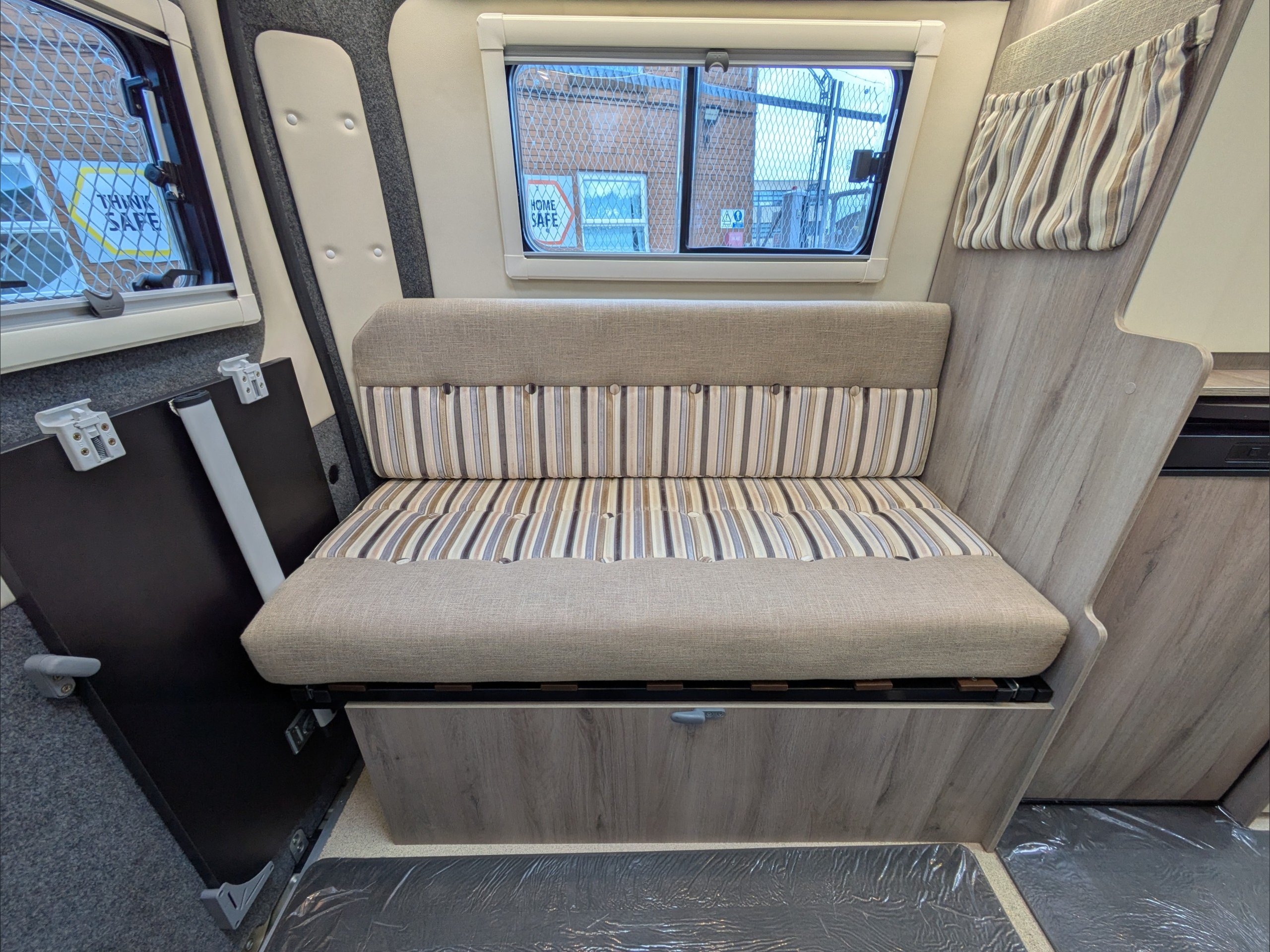 WildAx Aurora Leisure. 3 Berth, 3 Seatbelts. Standard Driving License Applicable. ULEZ Compliant. Situated at the front, the dinette conversion lounge can seat 3 people with the cab seats swiveled. Situated at the rear, the lounge comprises dual bench seats, which convert to a double bed. The kitchen comes with intergrill, fridge, hob, and extending counter top. The washroom comes with shower, wash basin, and cassette toilet. Available now at the Southern Motorhome Centre.