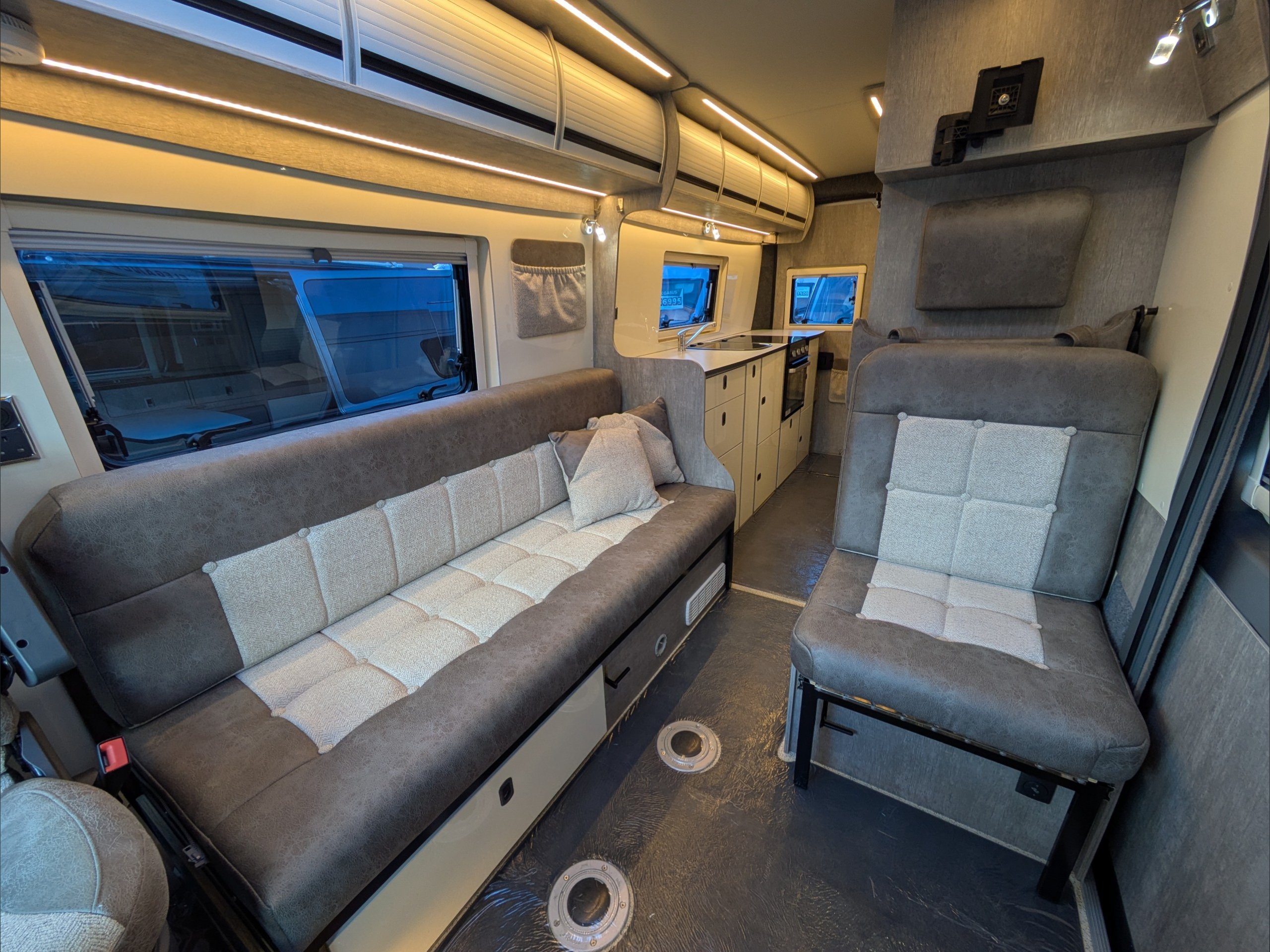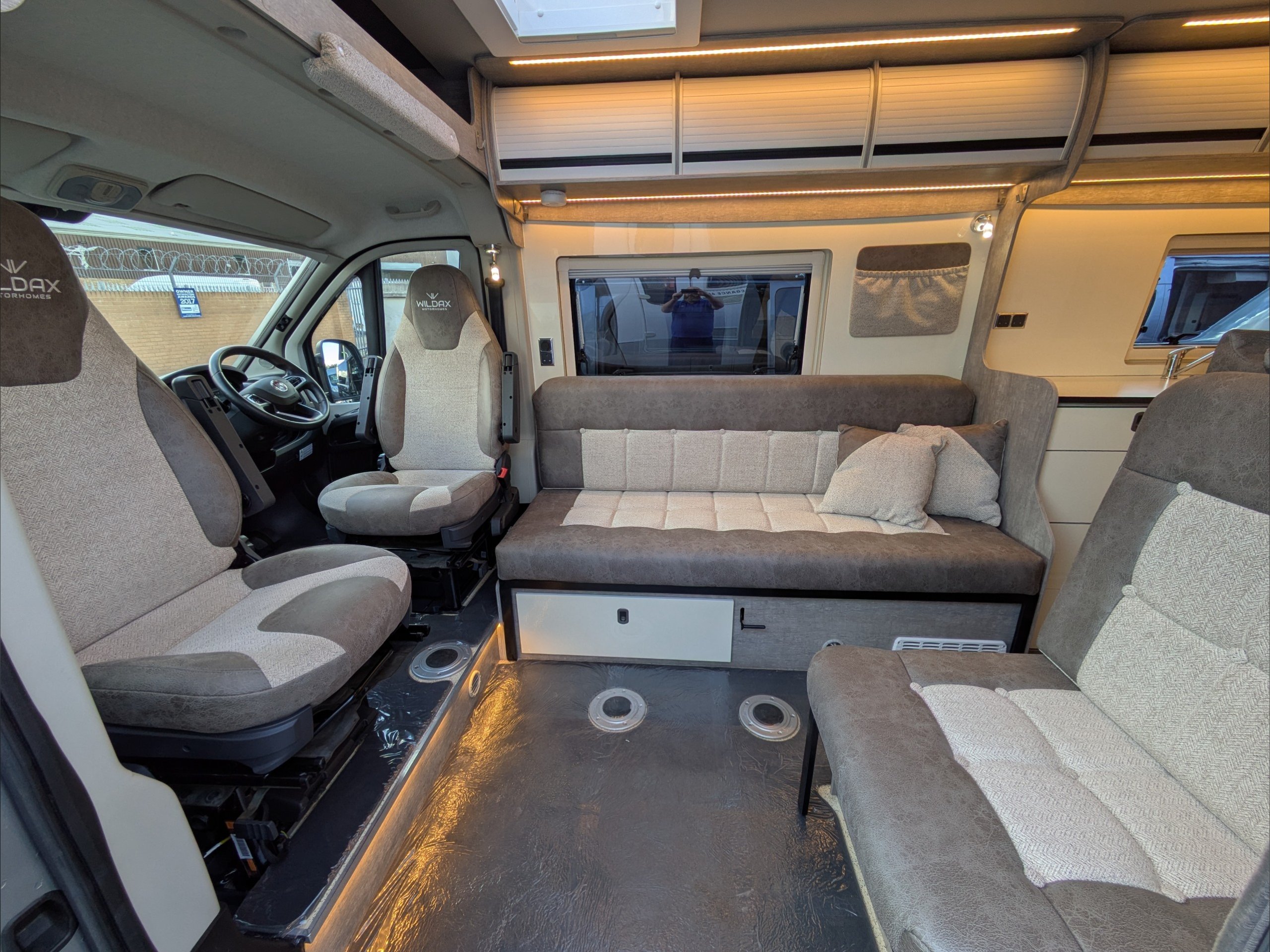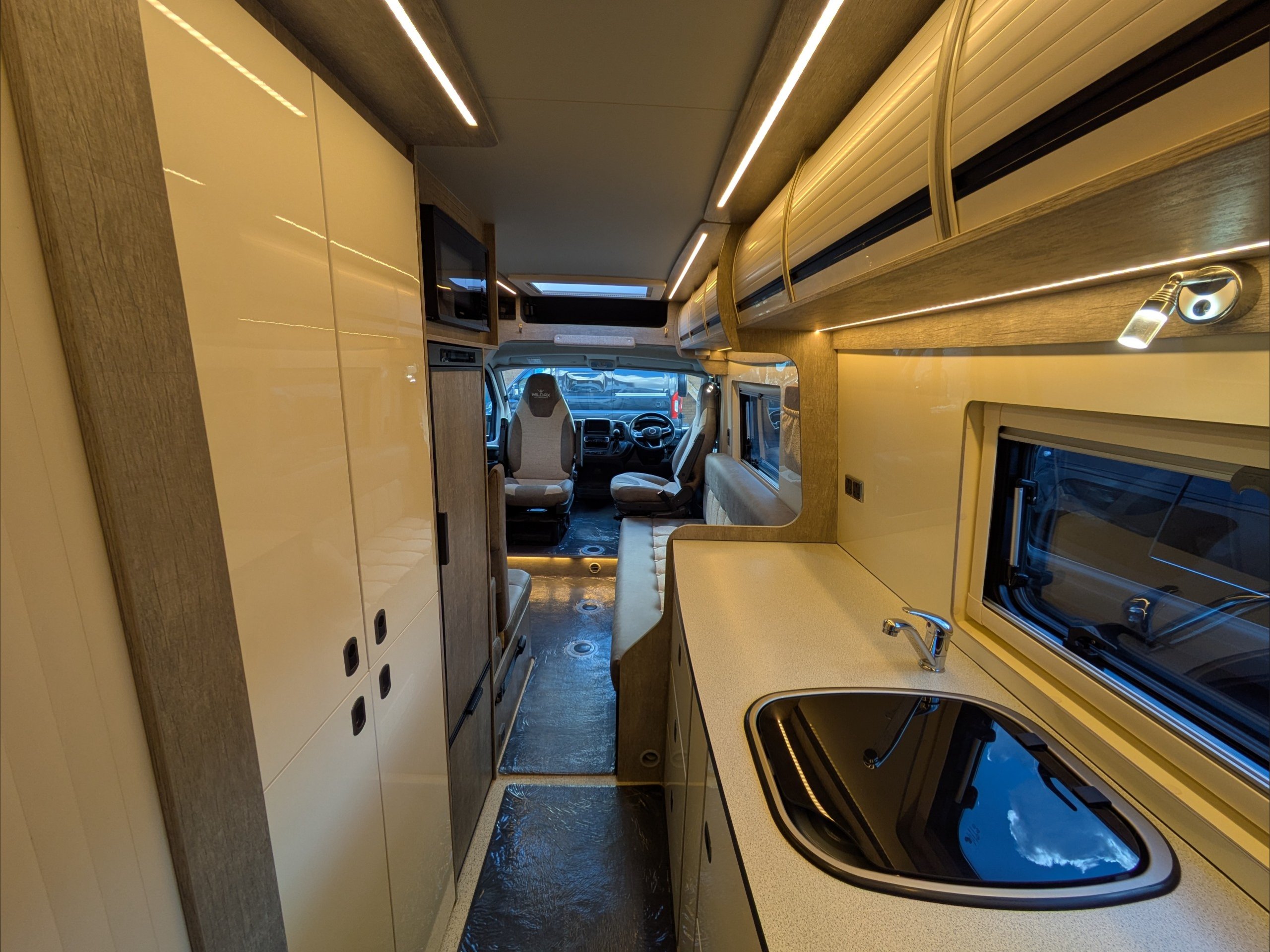 WildAx Constellation 3. 2 Berth, 3 Seatbelt. Standard Driving License Applicable. ULEZ Compiant. Situated at the front, the lounge can seat 4 people and converts to either a large double bed or twin singles. The kitchen comes with 3 way fridge, sink, hob, microwave, and intergrill. The washroom comes with shower, cassette toilet, and wash basin. Available at the Southern Motorhome Centre now.