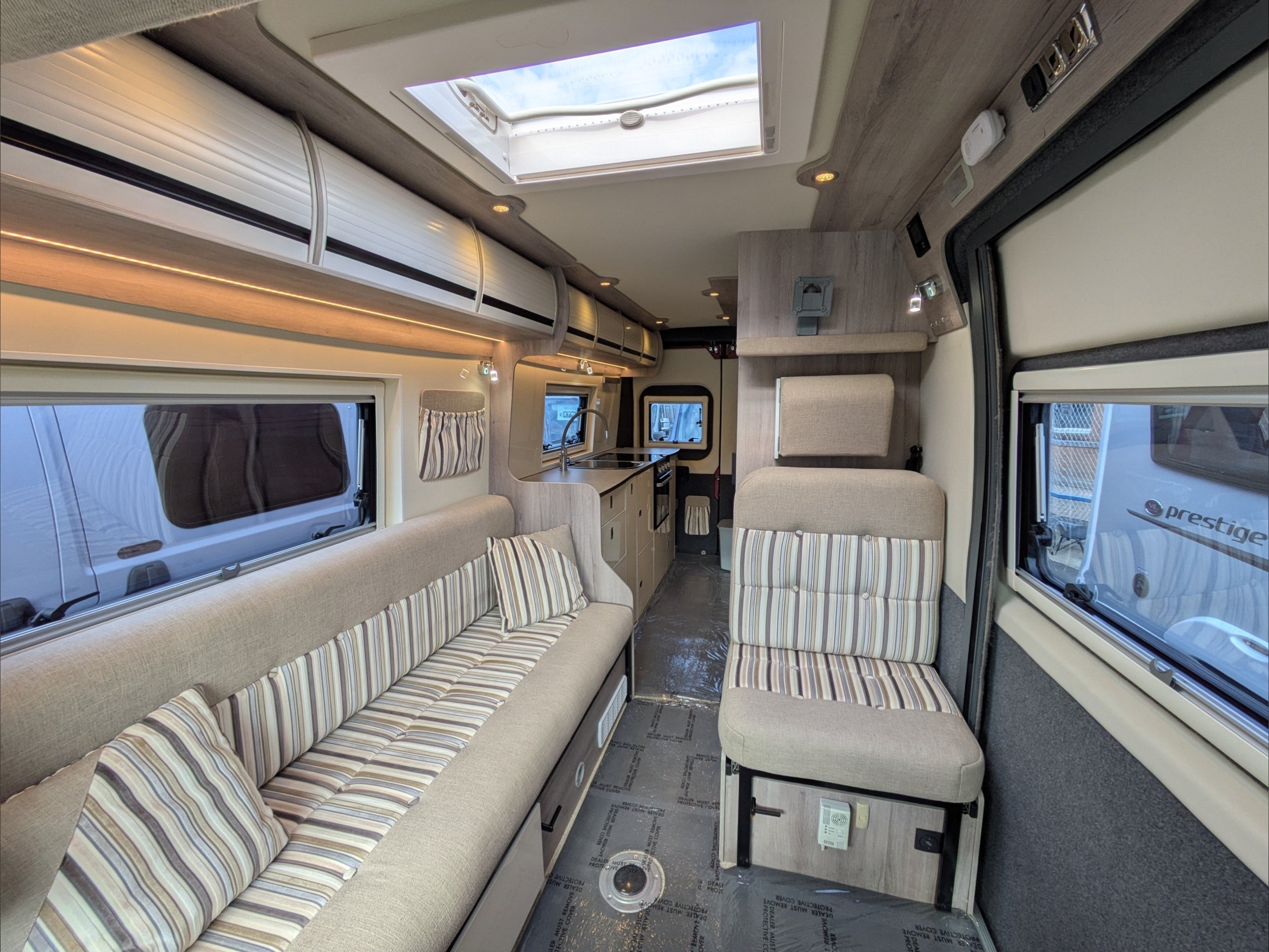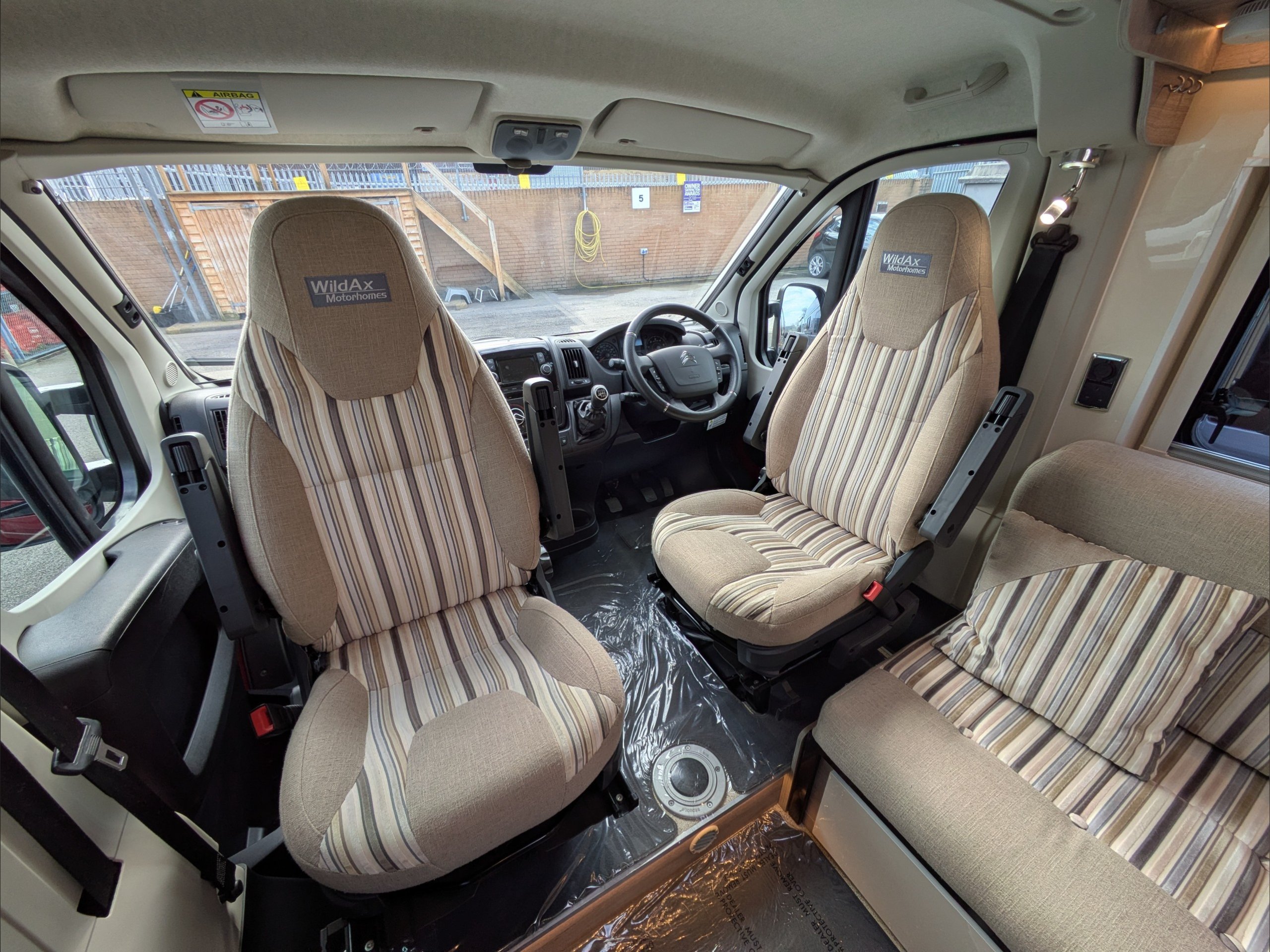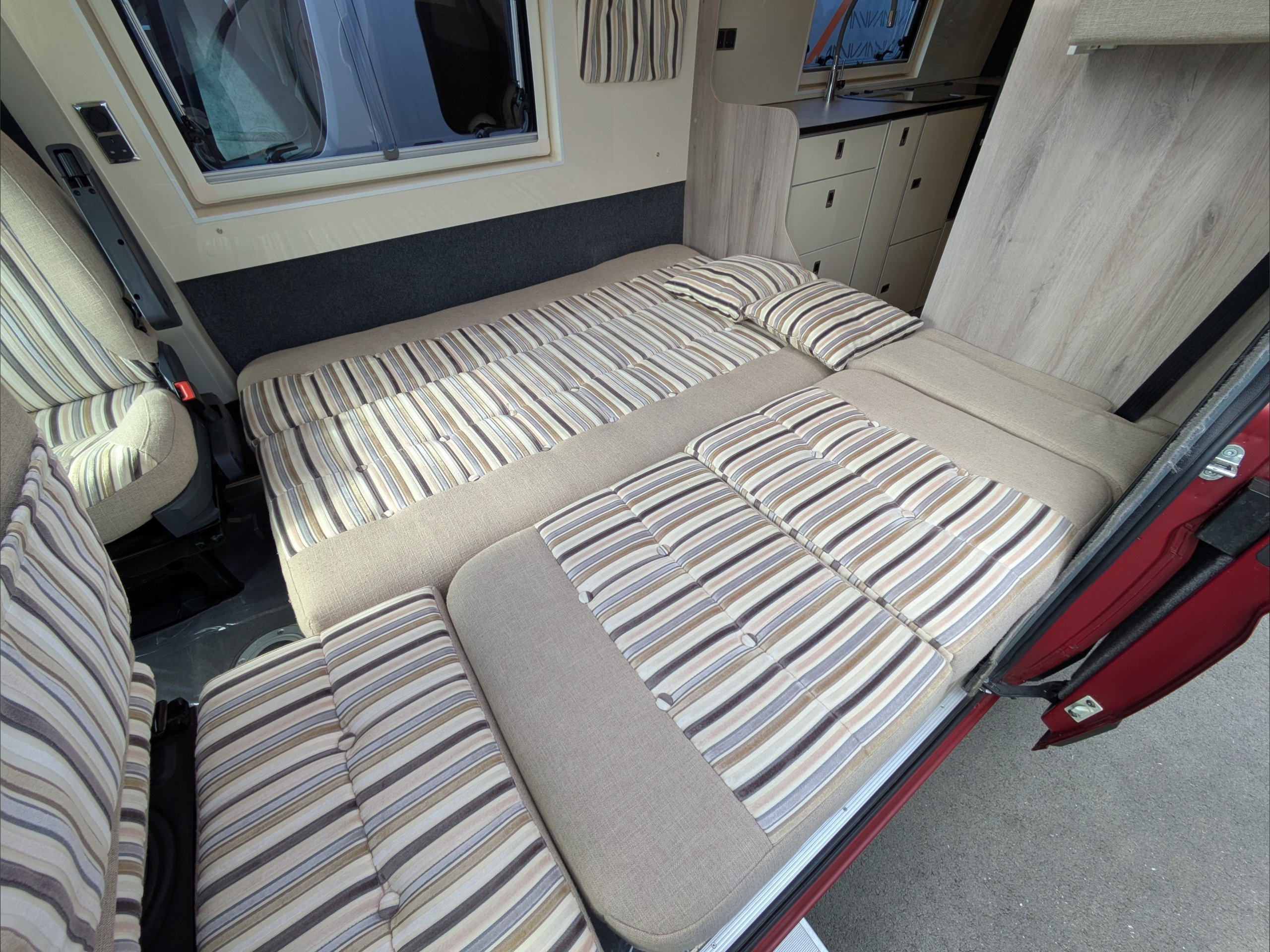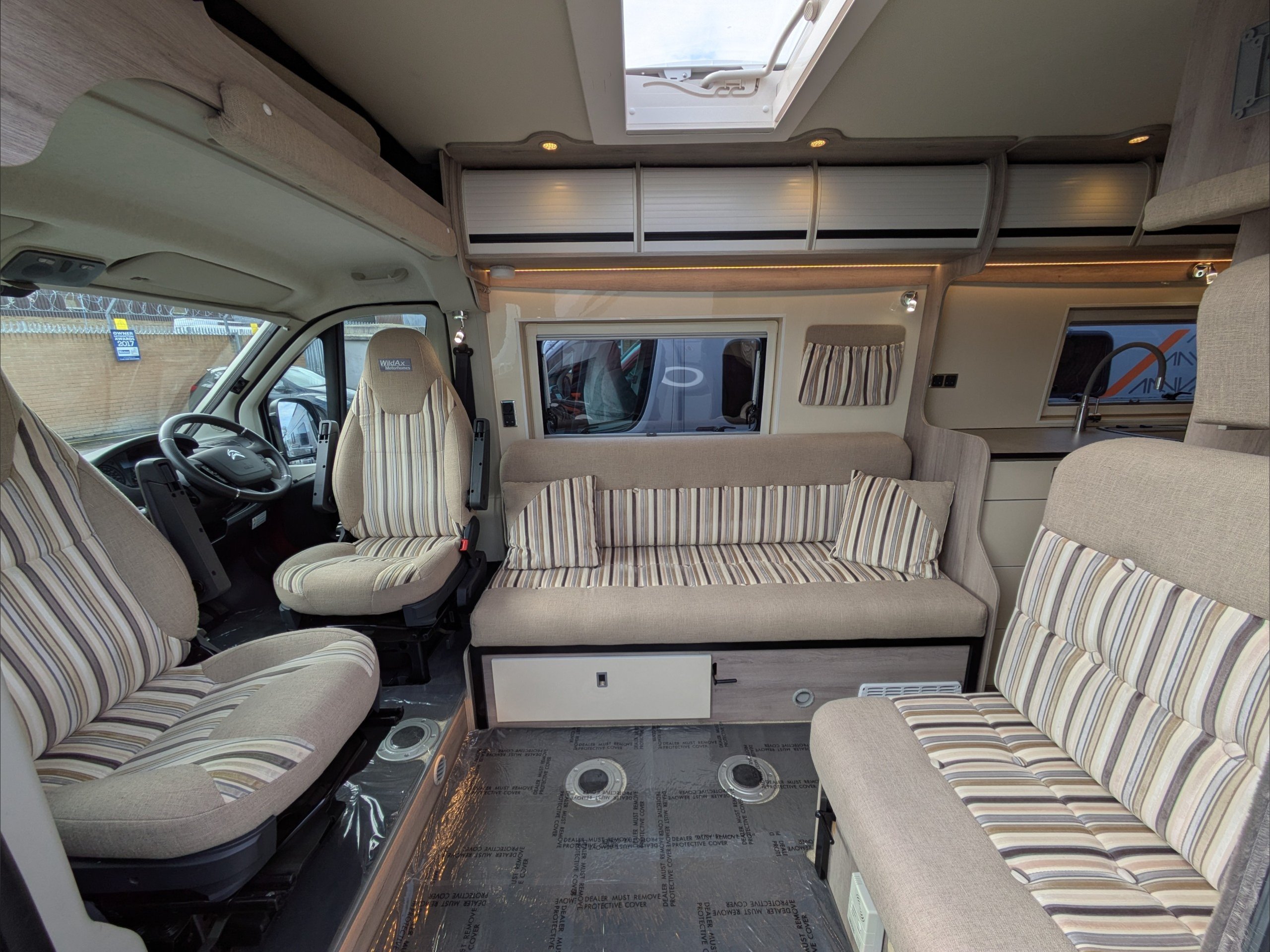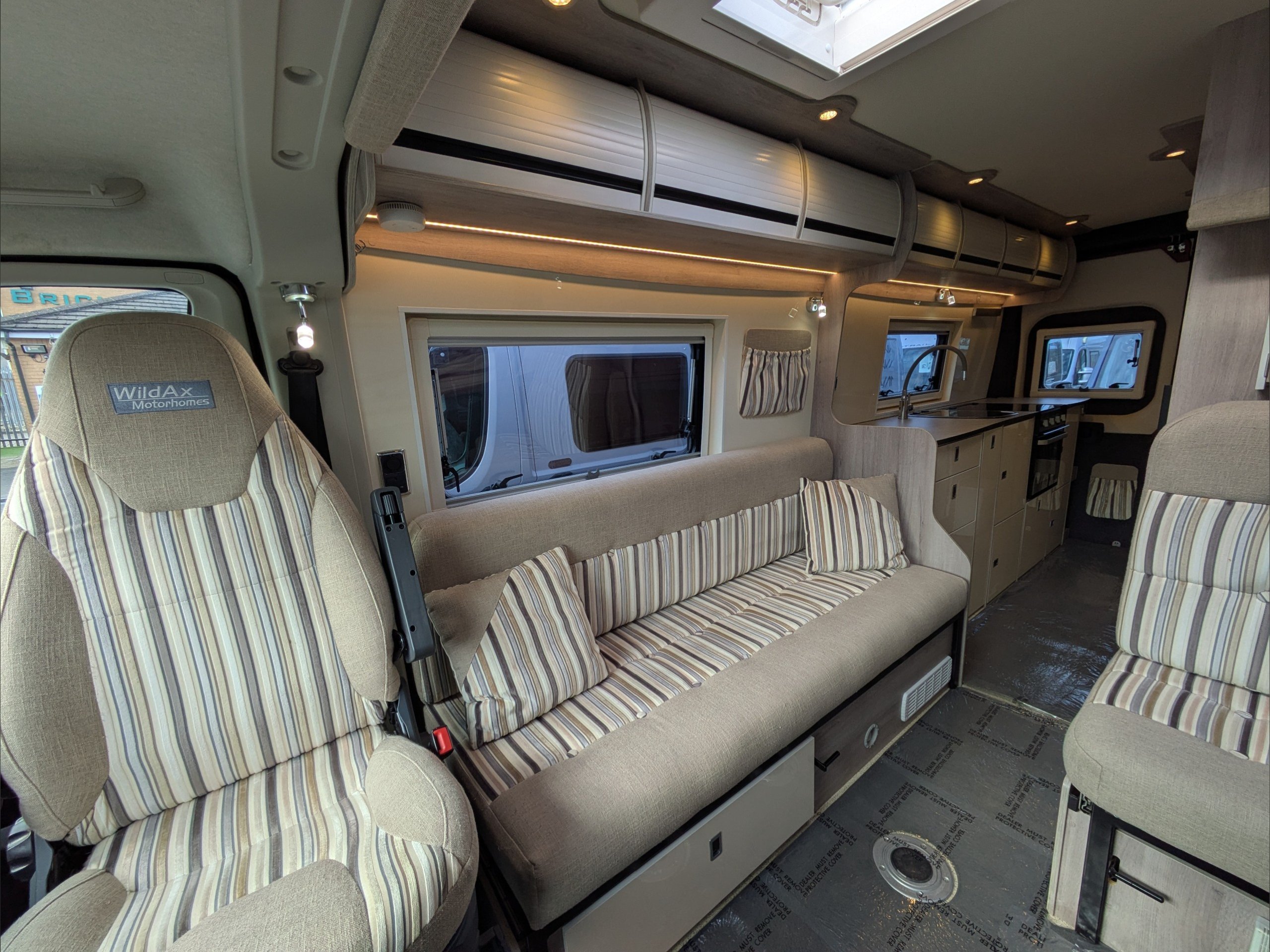 WildAx Constellation 3 XL. 2 Berth, 3 Seatbelt. Standard Driving License Applicable. ULEZ Compliant. Situated at the front, the lounge can seat 5 people with the cab seats swiveled, and can either be a large double bed or twin singles. The kitchen comes with sink, 3 way fridge, intergrill, hob, and microwave. The washroom comes with cassette toilet, wash basin, and shower. Available at the Southern Motorhome Centre now.