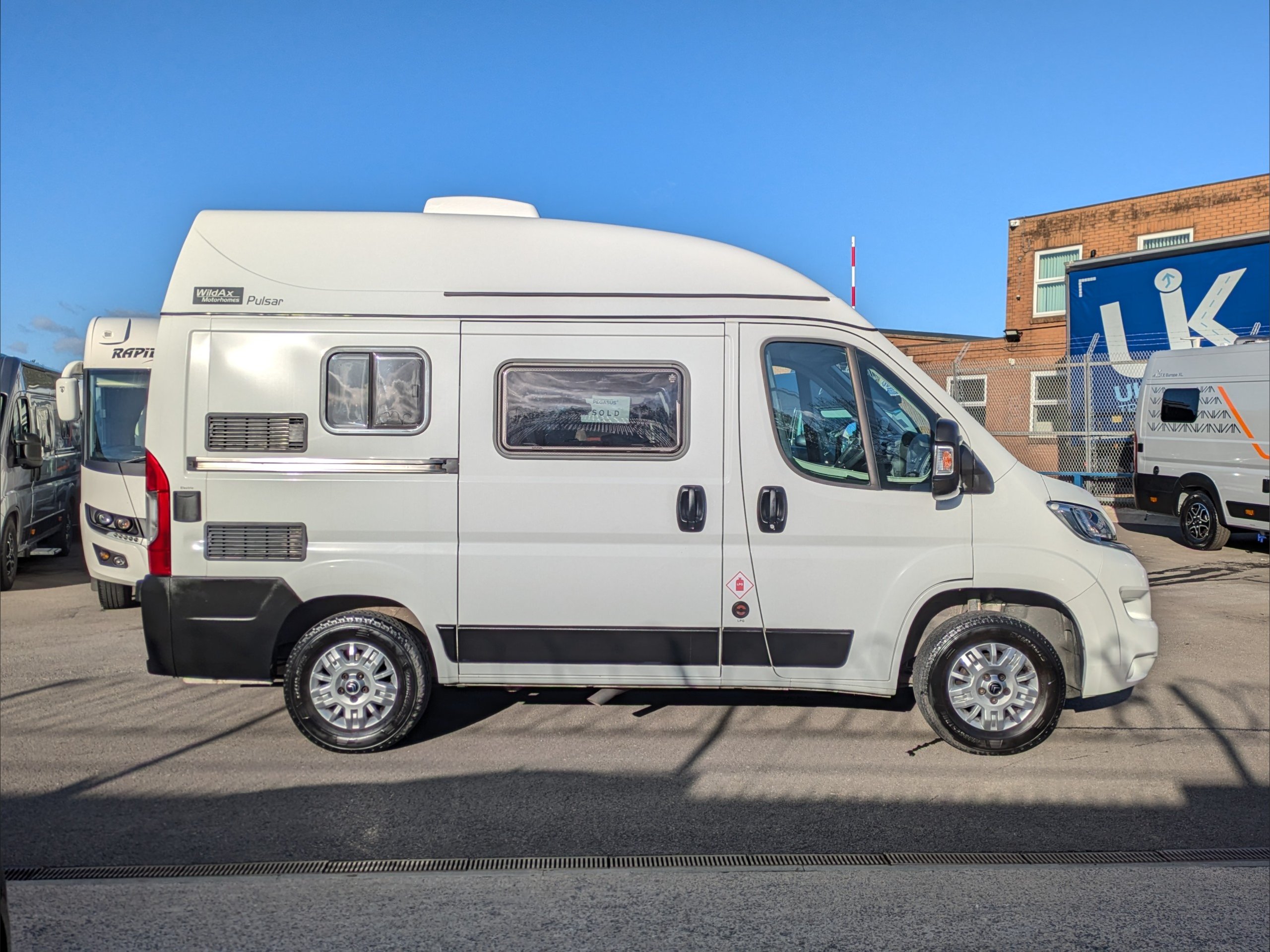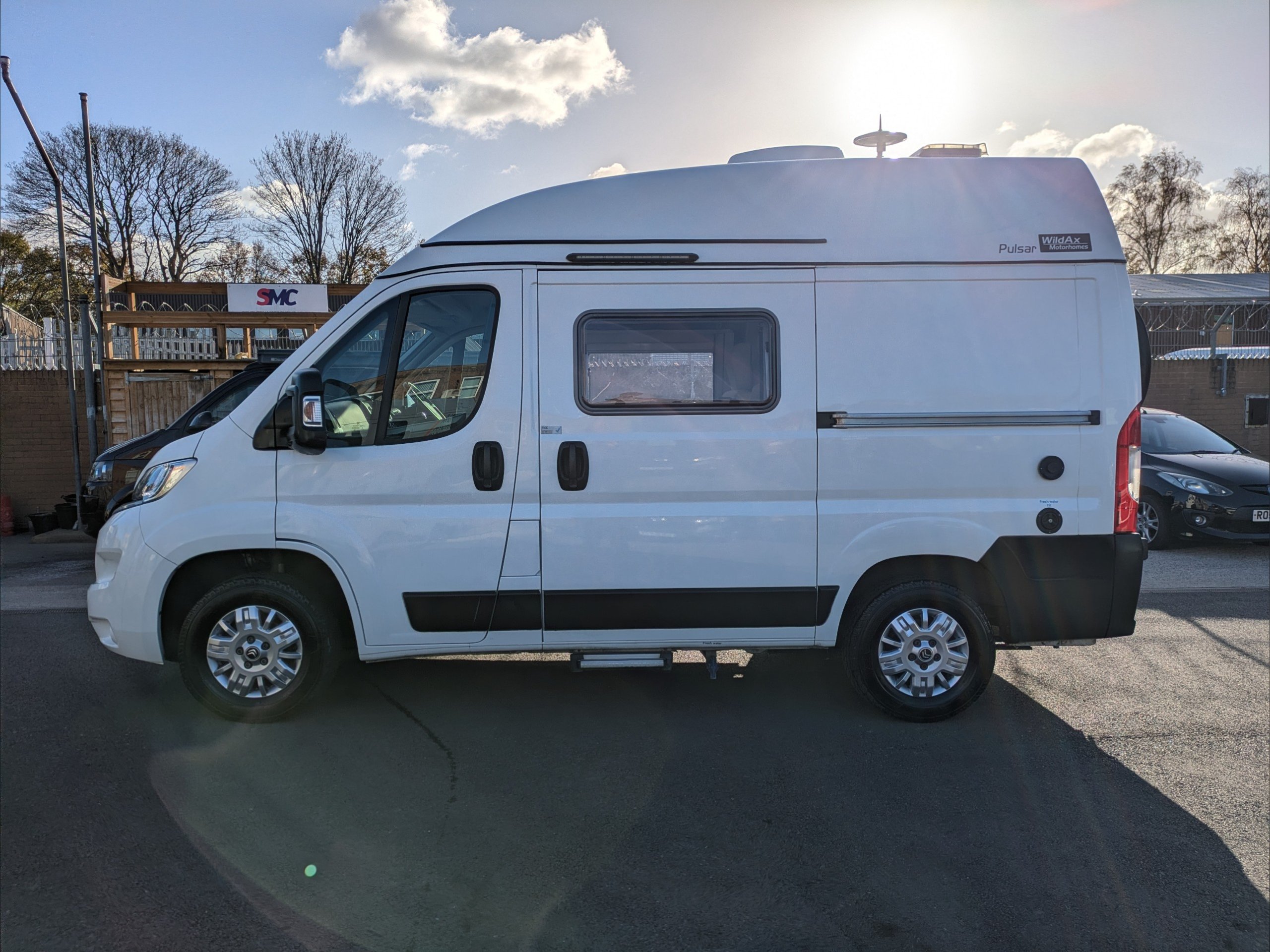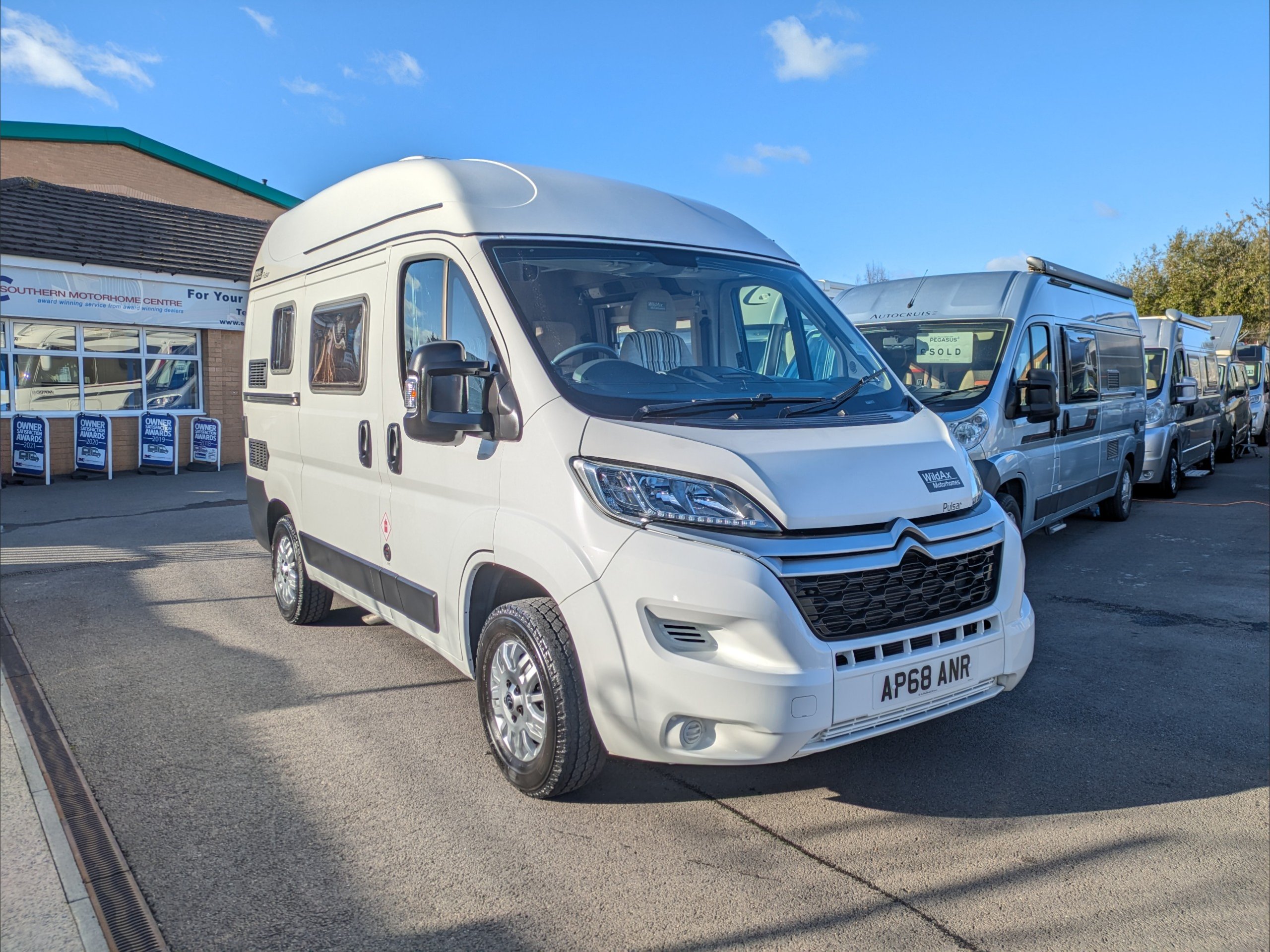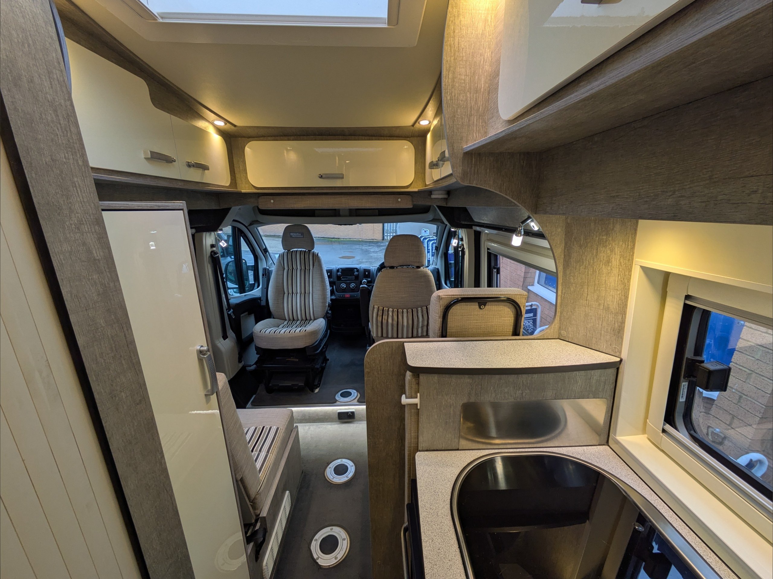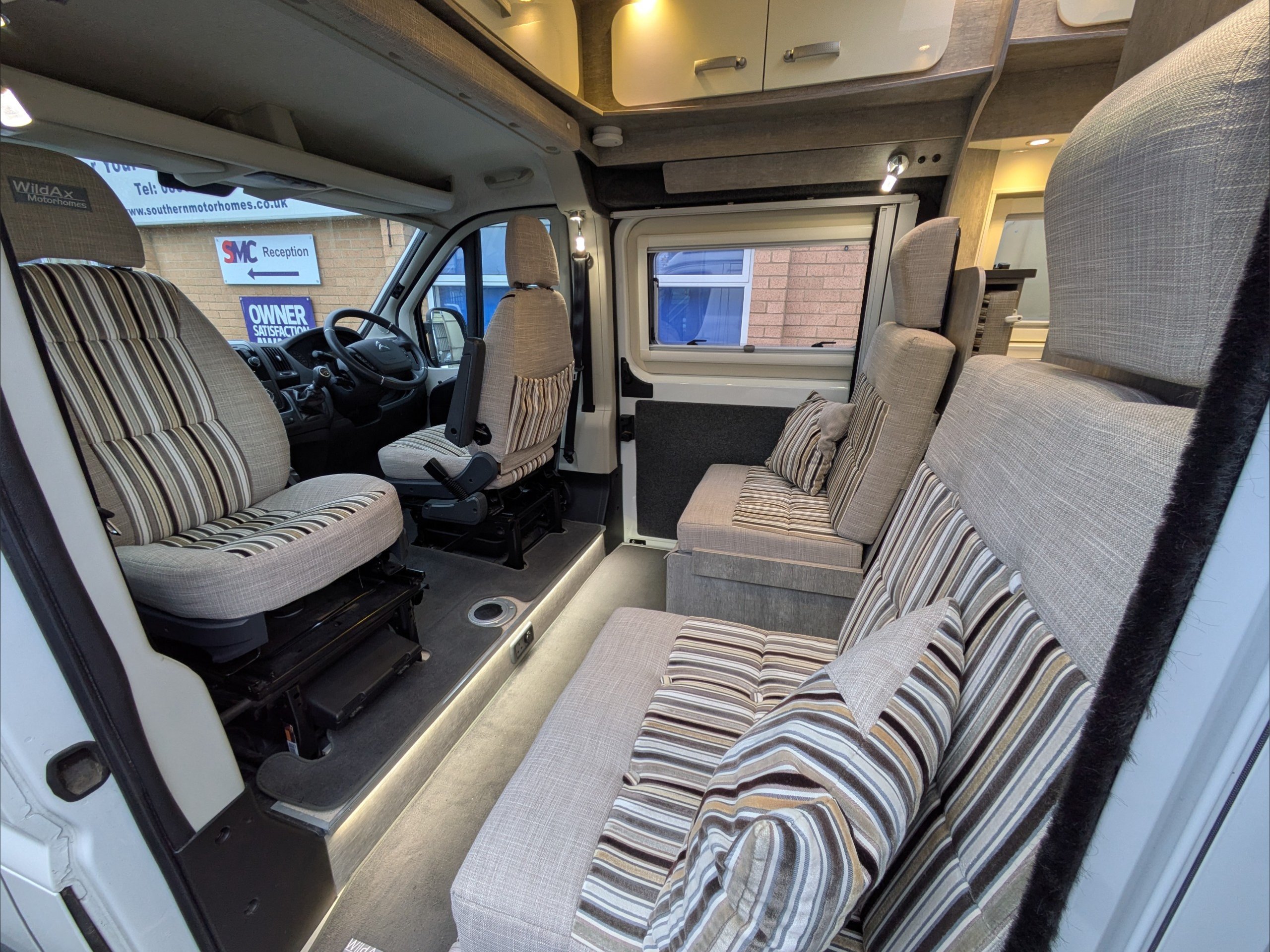 WildAx Pulsar. 2 Berth, 4 Seatbelts. Standard Driving License Applicable. ULEZ Compliant. Situated at the front, the lounge can seat 4 people, and converts to a double bed. The kitchen comes with intergrill, 3 way fridge, hob, and sink. The washroom comes with shower, cassette toilet, and wash basin. Available at the Southern Motorhome Centre now.